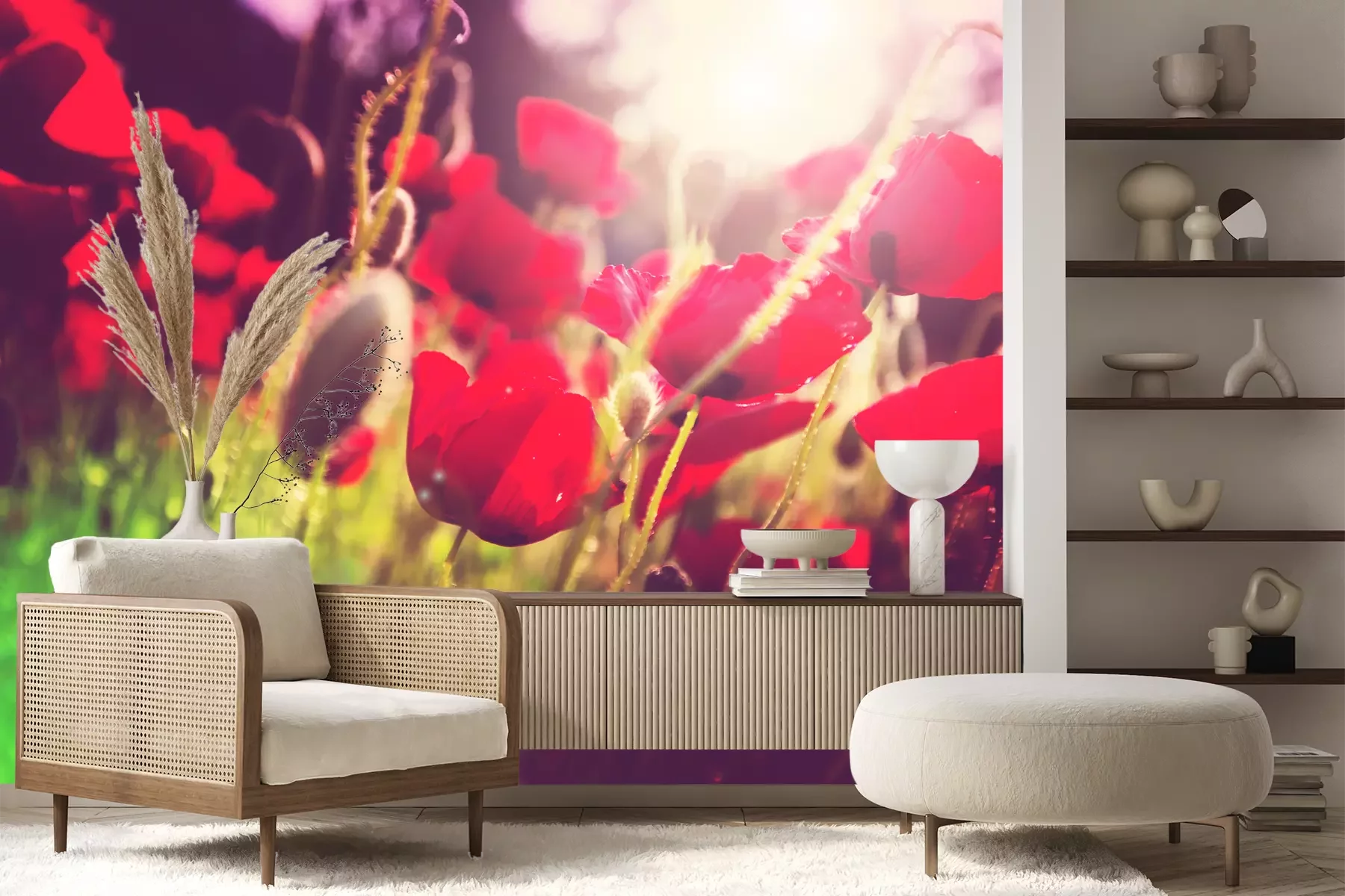 Het materiaal Premium+ is een gestructureerd vinyl op vlies met een gewicht van 255 g/m², dat kleine oneffenheden in de muur effectief camoufleert. De subtiele structuur van fijn zand geeft het oppervlak een exclusieve uitstraling, terwijl de halfmatte afwerking de diepte van de kleuren benadrukt. Het materiaal is dampdoorlatend, waardoor het ook in de keuken en badkamer kan worden gebruikt. De maximale breedte van één baan bedraagt 100 cm – bij grotere afmetingen wordt het fotobehang in meerdere gelijke banen verdeeld. De lijm wordt direct op de muur aangebracht en het behang wordt rand-aan-rand geplakt, wat zorgt voor een esthetisch resultaat zonder zichtbare naden. Het oppervlak kan gemakkelijk worden schoongemaakt door het voorzichtig af te nemen met een vochtige doek.