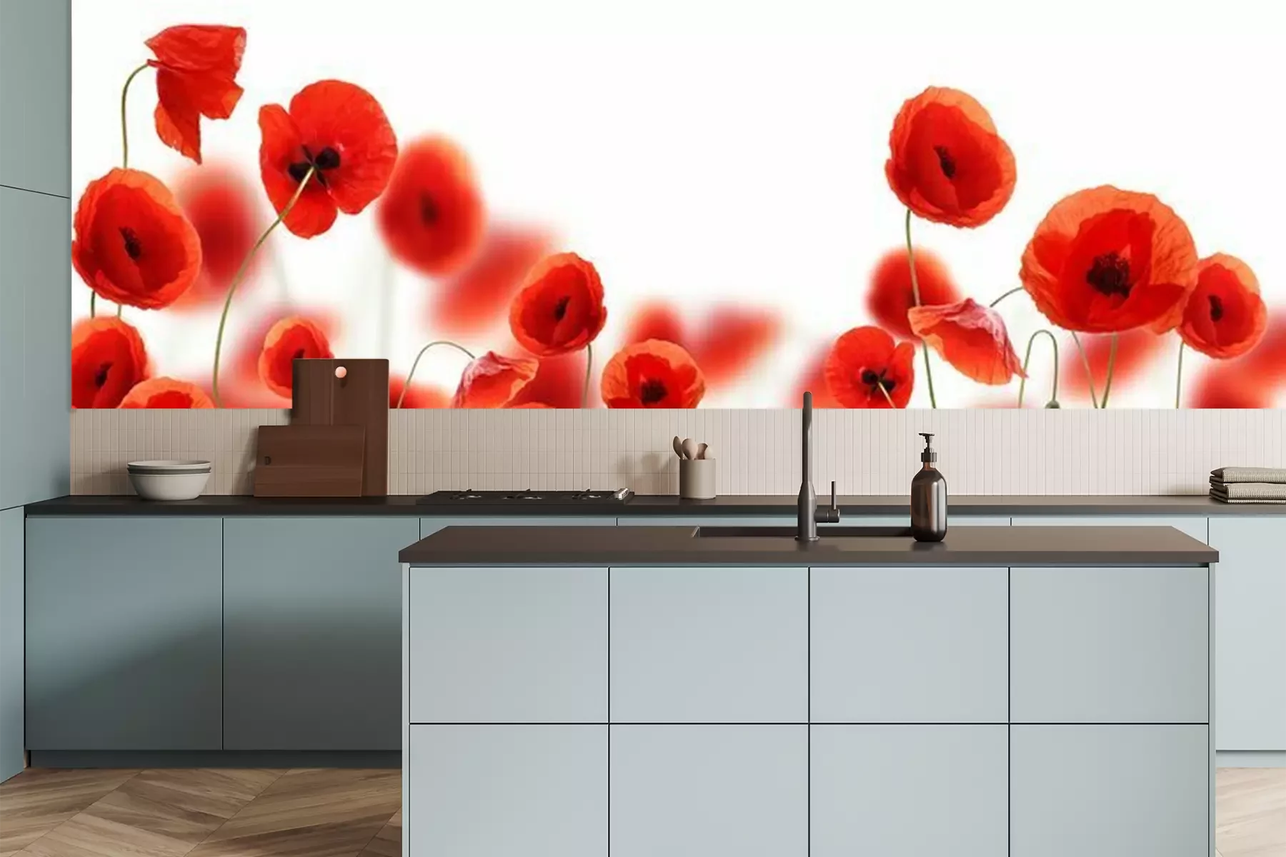 Het materiaal Premium is een glad vinyl op vlies, dat bestand is tegen uitrekken en vervorming. Het is dampdoorlatend – de muren kunnen vrij ademen – waardoor het geschikt is voor gebruik in de keuken en badkamer. Bij vervuiling kan het materiaal worden afgenomen met een vochtige doek. De maximale breedte van één baan bedraagt 95 of 105 cm, afhankelijk van de beschikbaarheid. Montage vindt plaats met de rand-aan-rand methode, wat een esthetisch resultaat zonder zichtbare naden oplevert. Omdat de lijm rechtstreeks op de muur wordt aangebracht, verloopt de installatie van het fotobehang snel en eenvoudig.