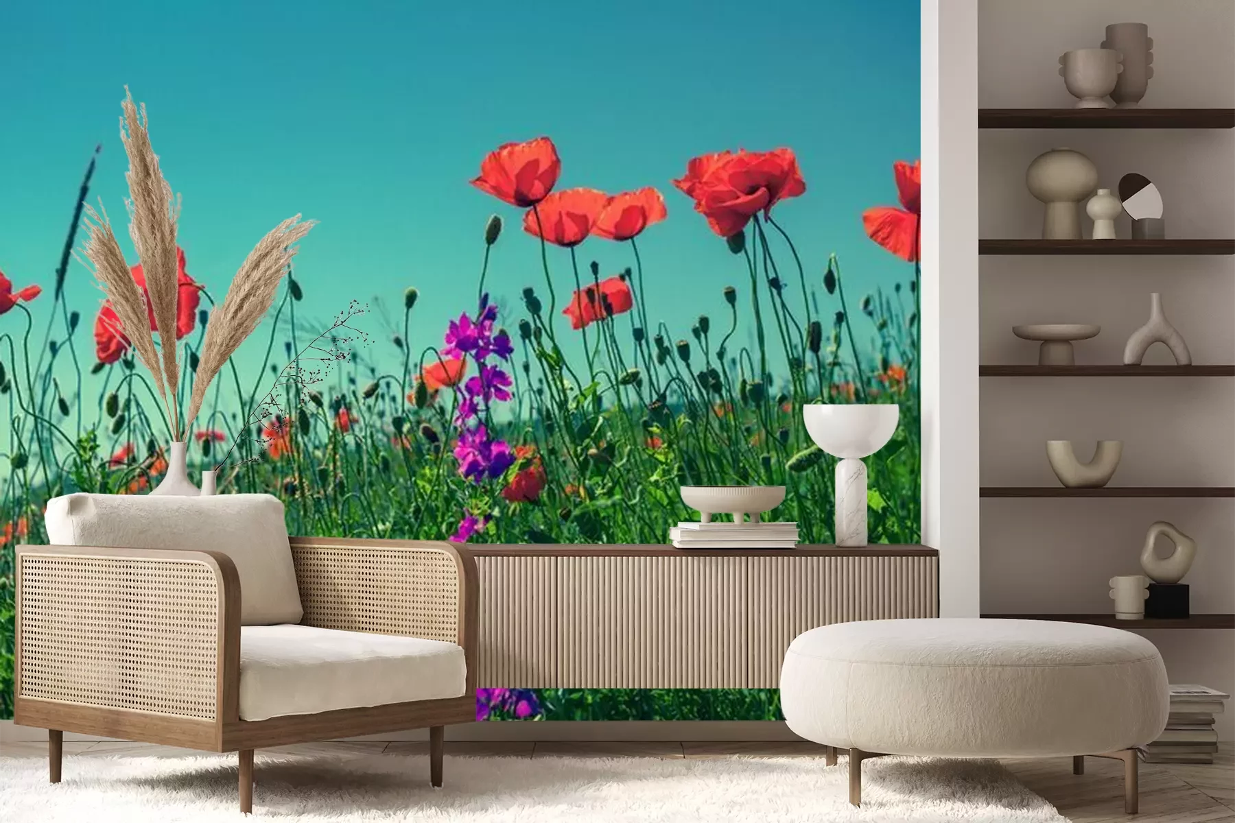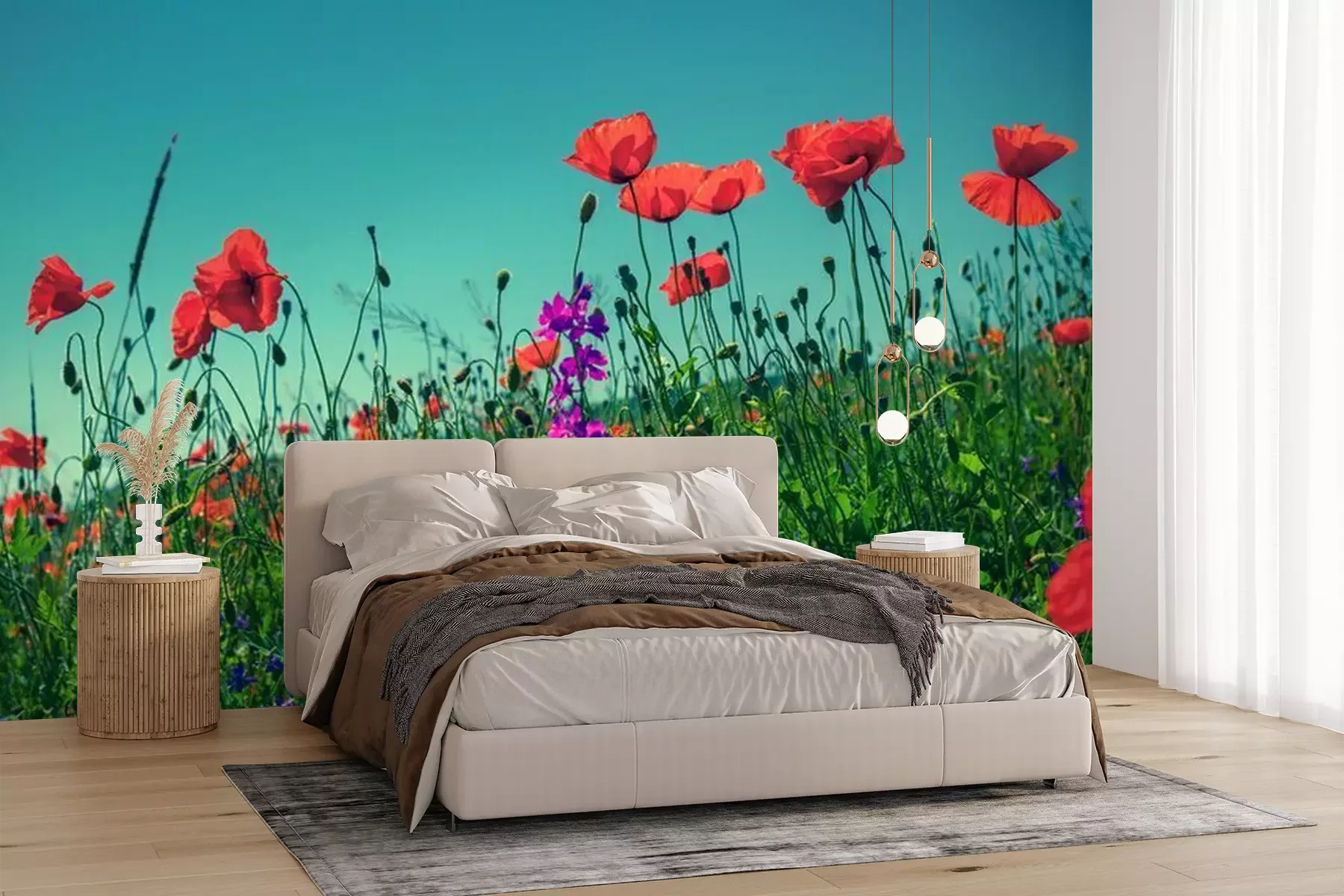 Het materiaal Premium+ is een gestructureerd vinyl op vlies met een gewicht van 255 g/m², dat kleine oneffenheden in de muur effectief camoufleert. De subtiele structuur van fijn zand geeft het oppervlak een exclusieve uitstraling, terwijl de halfmatte afwerking de diepte van de kleuren benadrukt. Het materiaal is dampdoorlatend, waardoor het ook in de keuken en badkamer kan worden gebruikt. De maximale breedte van één baan bedraagt 100 cm – bij grotere afmetingen wordt het fotobehang in meerdere gelijke banen verdeeld. De lijm wordt direct op de muur aangebracht en het behang wordt rand-aan-rand geplakt, wat zorgt voor een esthetisch resultaat zonder zichtbare naden. Het oppervlak kan gemakkelijk worden schoongemaakt door het voorzichtig af te nemen met een vochtige doek.