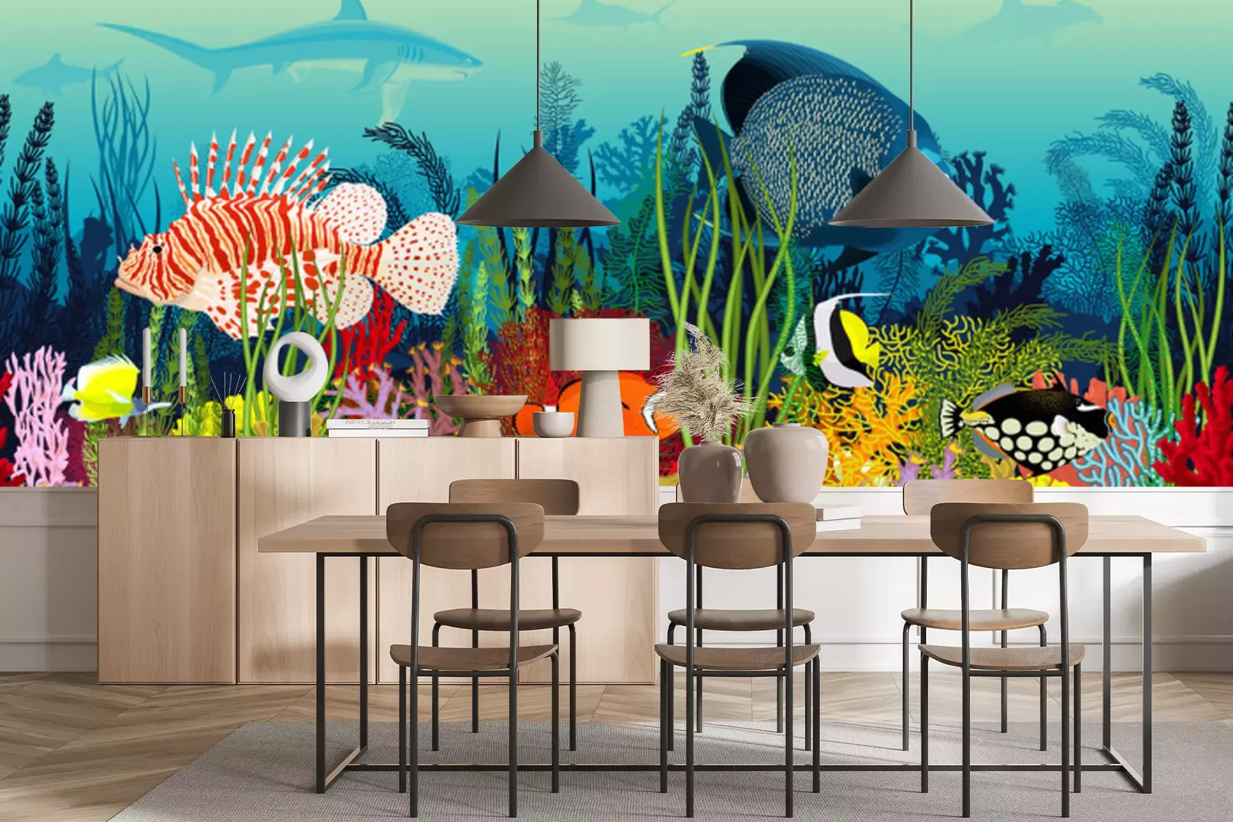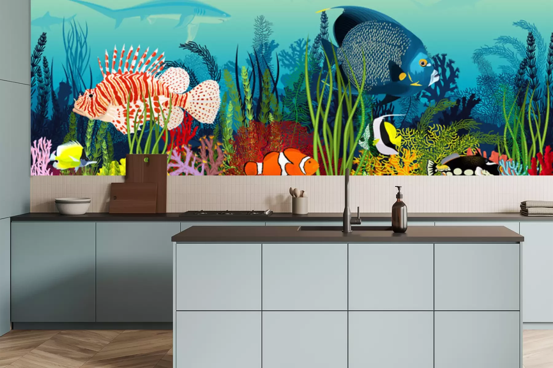 Fotobehang Kleurrijk patroon met tropische vissen en planten