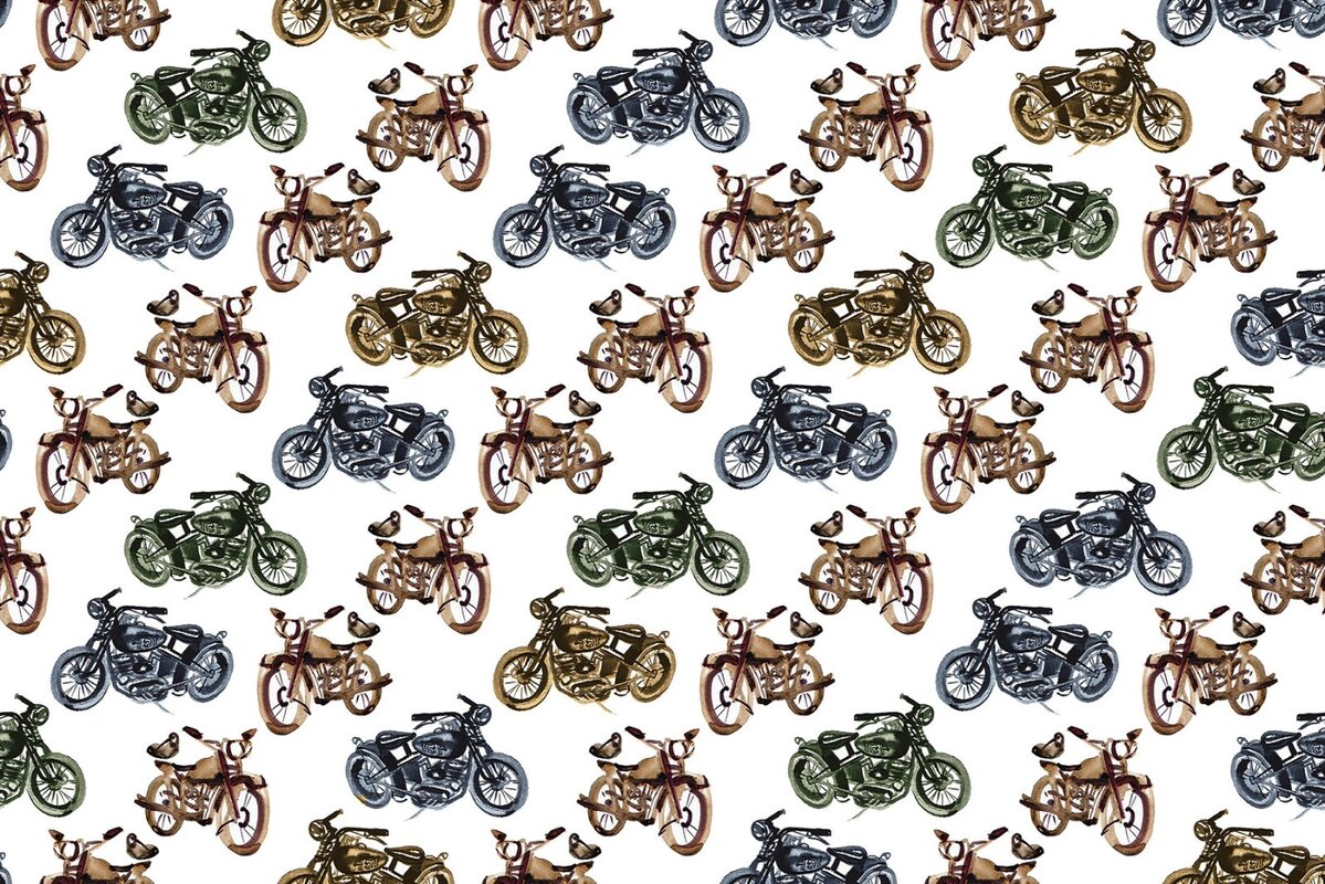 Fotobehang: Kleurrijk retro motorfietspatroon op witte achtergrond