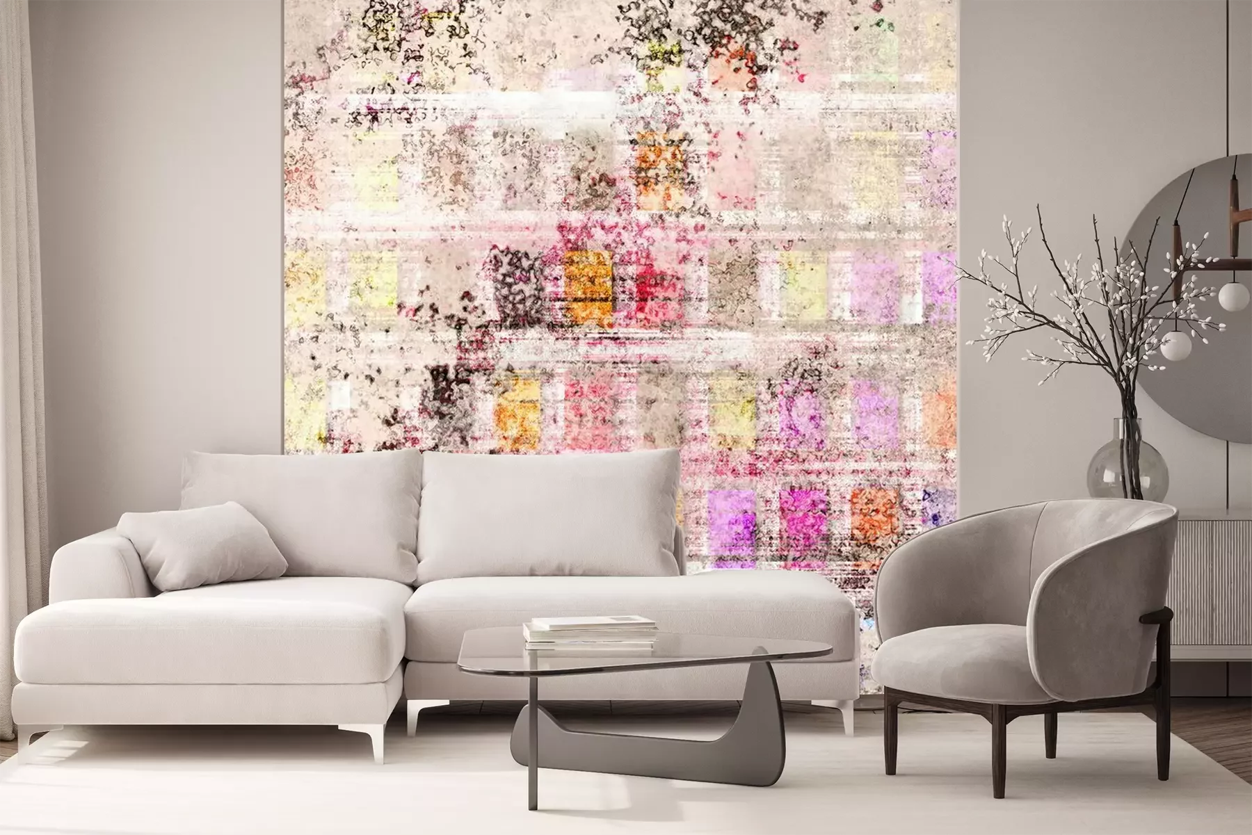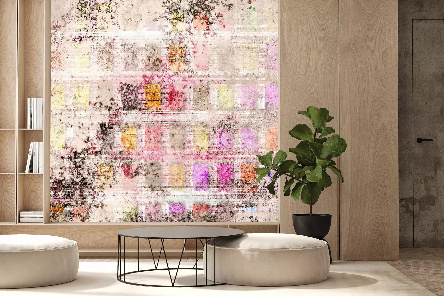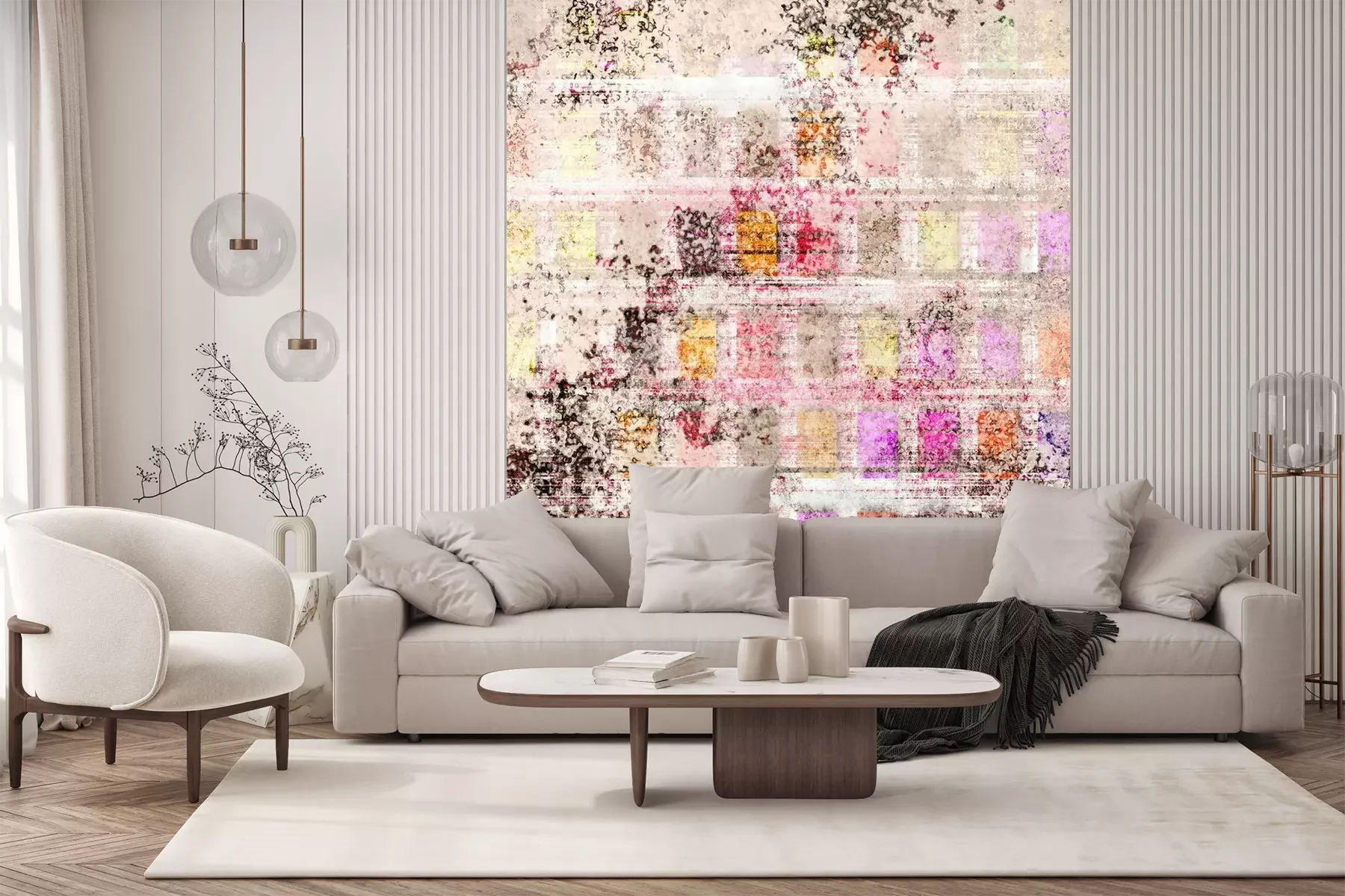 Het materiaal Premium+ is een gestructureerd vinyl op vlies met een gewicht van 255 g/m², dat kleine oneffenheden in de muur effectief camoufleert. De subtiele structuur van fijn zand geeft het oppervlak een exclusieve uitstraling, terwijl de halfmatte afwerking de diepte van de kleuren benadrukt. Het materiaal is dampdoorlatend, waardoor het ook in de keuken en badkamer kan worden gebruikt. De maximale breedte van één baan bedraagt 100 cm – bij grotere afmetingen wordt het fotobehang in meerdere gelijke banen verdeeld. De lijm wordt direct op de muur aangebracht en het behang wordt rand-aan-rand geplakt, wat zorgt voor een esthetisch resultaat zonder zichtbare naden. Het oppervlak kan gemakkelijk worden schoongemaakt door het voorzichtig af te nemen met een vochtige doek.