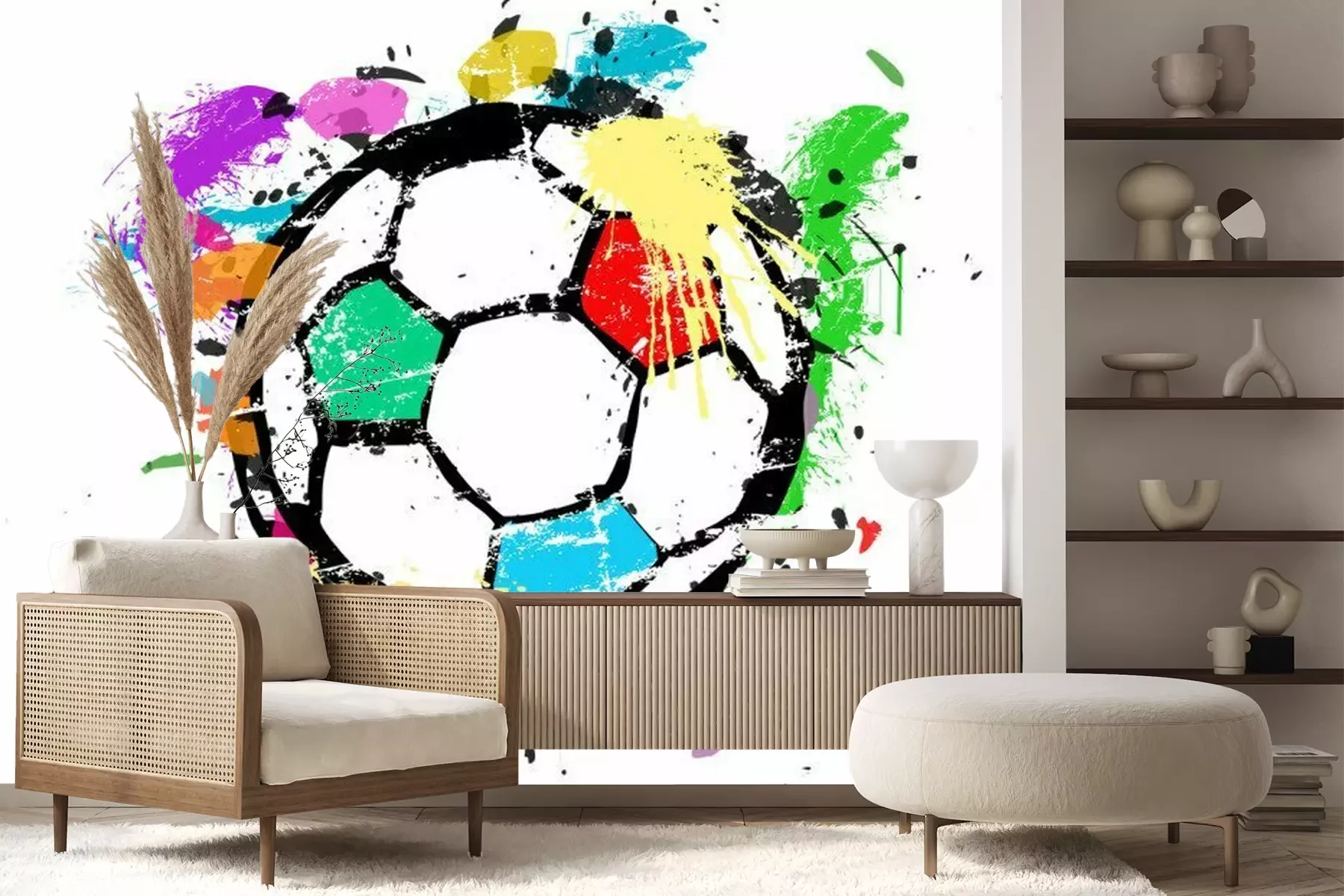 Het materiaal Premium+ is een gestructureerd vinyl op vlies met een gewicht van 255 g/m², dat kleine oneffenheden in de muur effectief camoufleert. De subtiele structuur van fijn zand geeft het oppervlak een exclusieve uitstraling, terwijl de halfmatte afwerking de diepte van de kleuren benadrukt. Het materiaal is dampdoorlatend, waardoor het ook in de keuken en badkamer kan worden gebruikt. De maximale breedte van één baan bedraagt 100 cm – bij grotere afmetingen wordt het fotobehang in meerdere gelijke banen verdeeld. De lijm wordt direct op de muur aangebracht en het behang wordt rand-aan-rand geplakt, wat zorgt voor een esthetisch resultaat zonder zichtbare naden. Het oppervlak kan gemakkelijk worden schoongemaakt door het voorzichtig af te nemen met een vochtige doek.