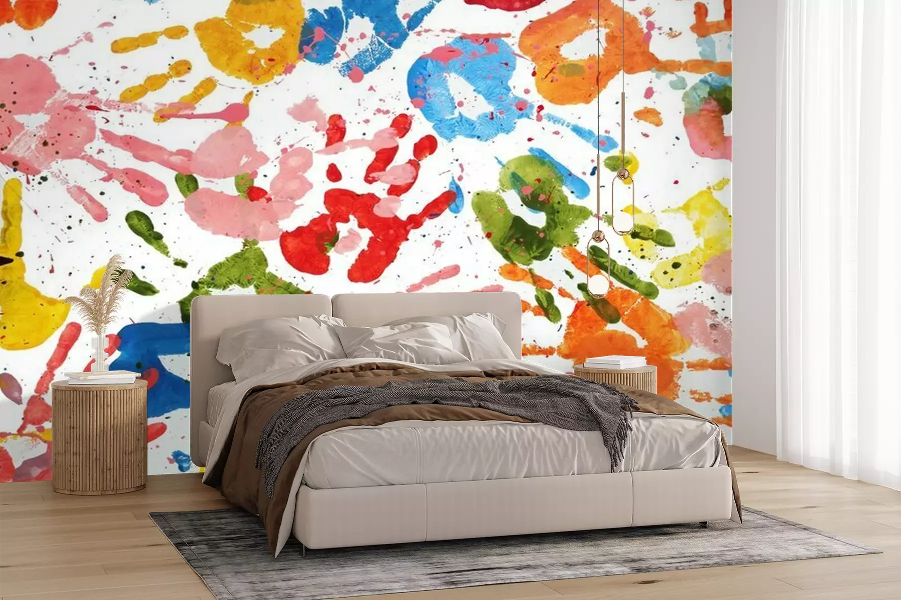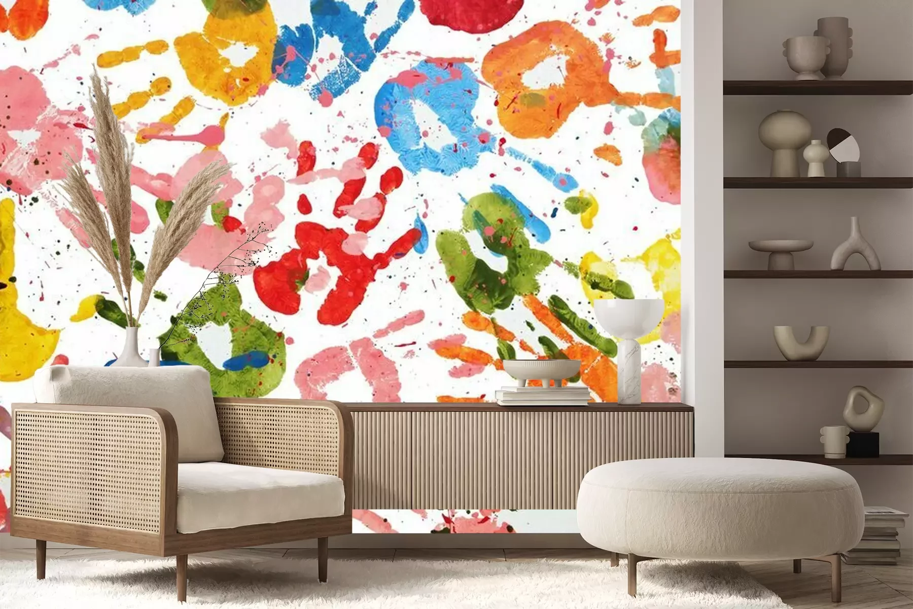 Fotobehang Kleurrijke kinderhandafdrukken op witte achtergrond