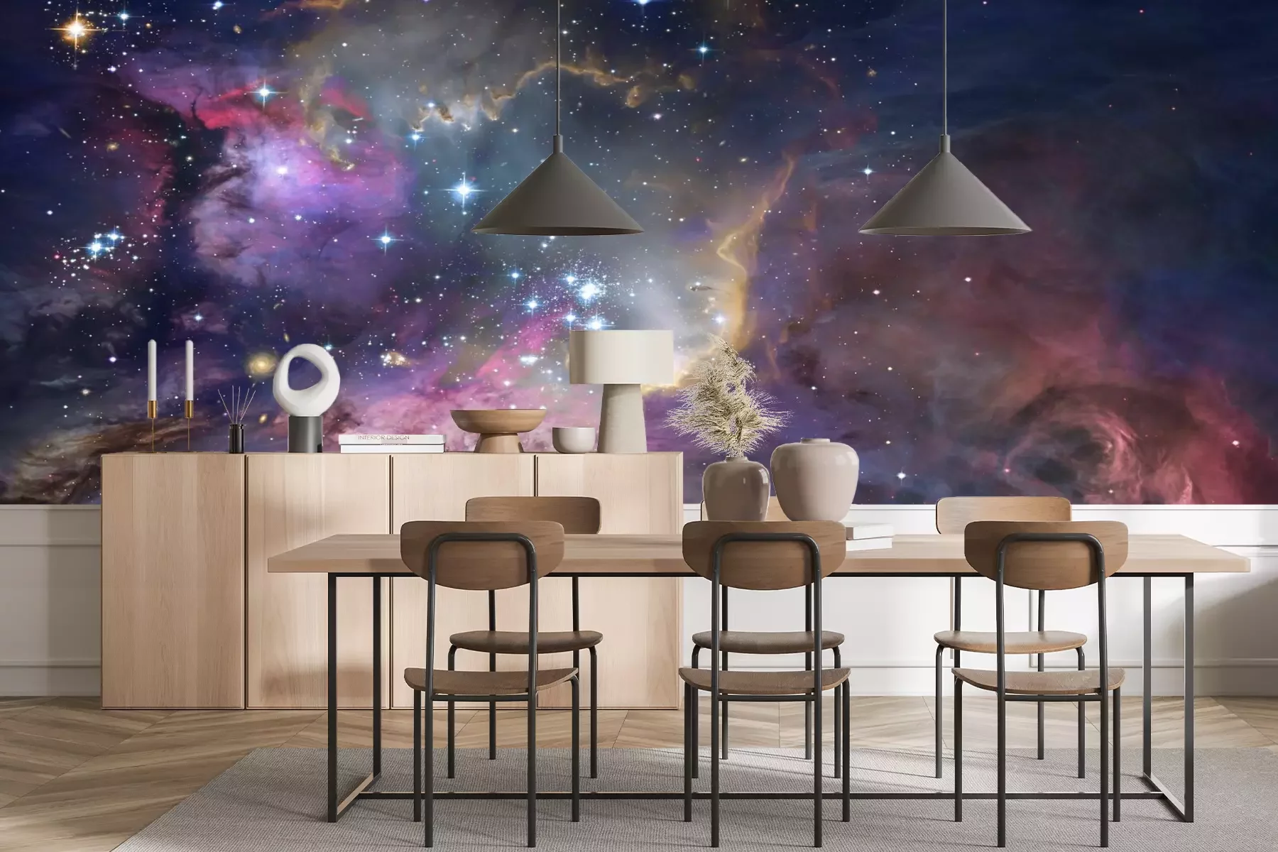 Het materiaal Premium+ is een gestructureerd vinyl op vlies met een gewicht van 255 g/m², dat kleine oneffenheden in de muur effectief camoufleert. De subtiele structuur van fijn zand geeft het oppervlak een exclusieve uitstraling, terwijl de halfmatte afwerking de diepte van de kleuren benadrukt. Het materiaal is dampdoorlatend, waardoor het ook in de keuken en badkamer kan worden gebruikt. De maximale breedte van één baan bedraagt 100 cm – bij grotere afmetingen wordt het fotobehang in meerdere gelijke banen verdeeld. De lijm wordt direct op de muur aangebracht en het behang wordt rand-aan-rand geplakt, wat zorgt voor een esthetisch resultaat zonder zichtbare naden. Het oppervlak kan gemakkelijk worden schoongemaakt door het voorzichtig af te nemen met een vochtige doek.