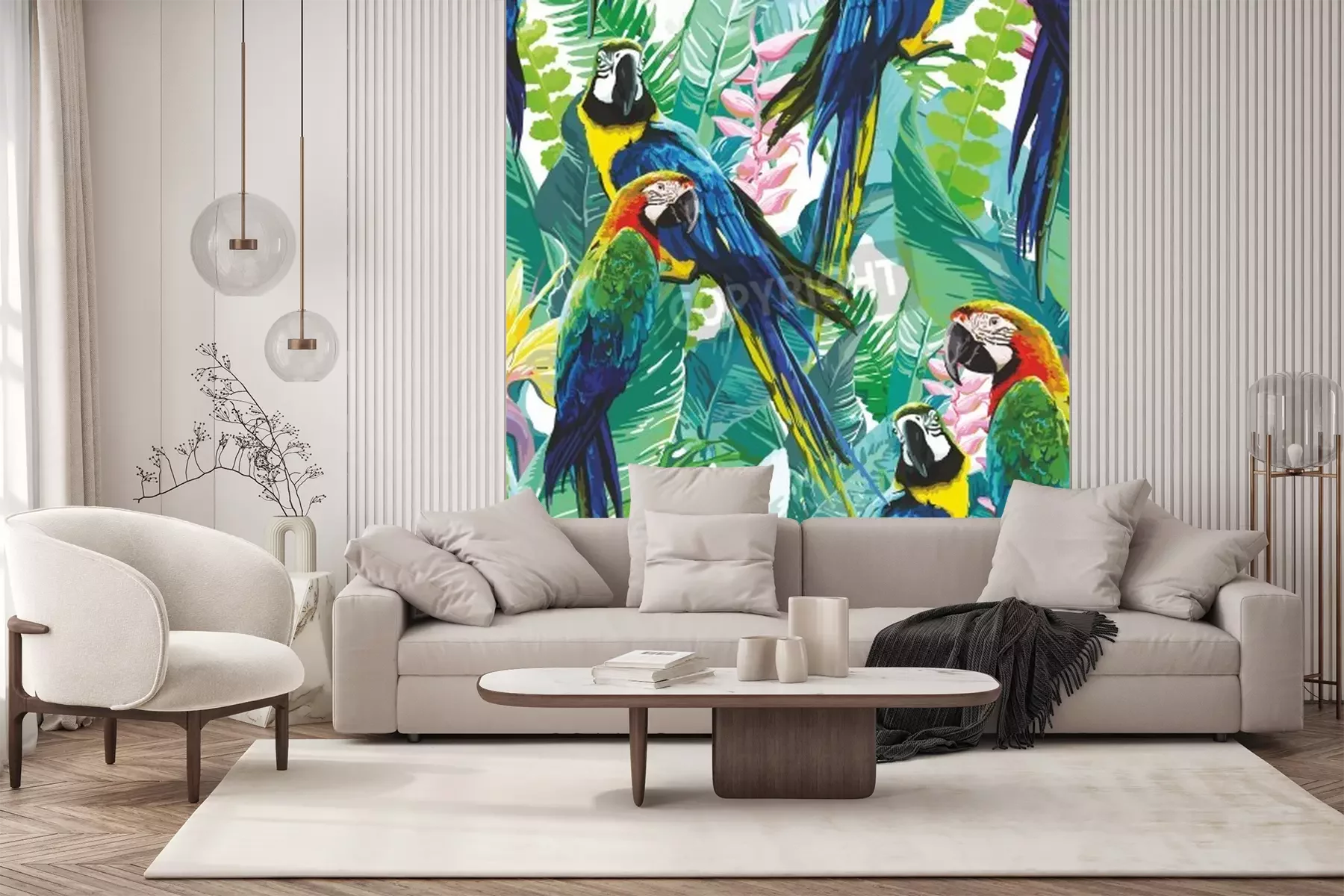 Het fotobehang wordt geleverd in banen. De afmetingen en het aantal banen waaruit het volledige fotobehang bestaat, zijn afhankelijk van het gekozen materiaal. Wanneer het formaat de maximale materiaalbreedte overschrijdt, bestaat de print uit meerdere gelijkmatige banen.