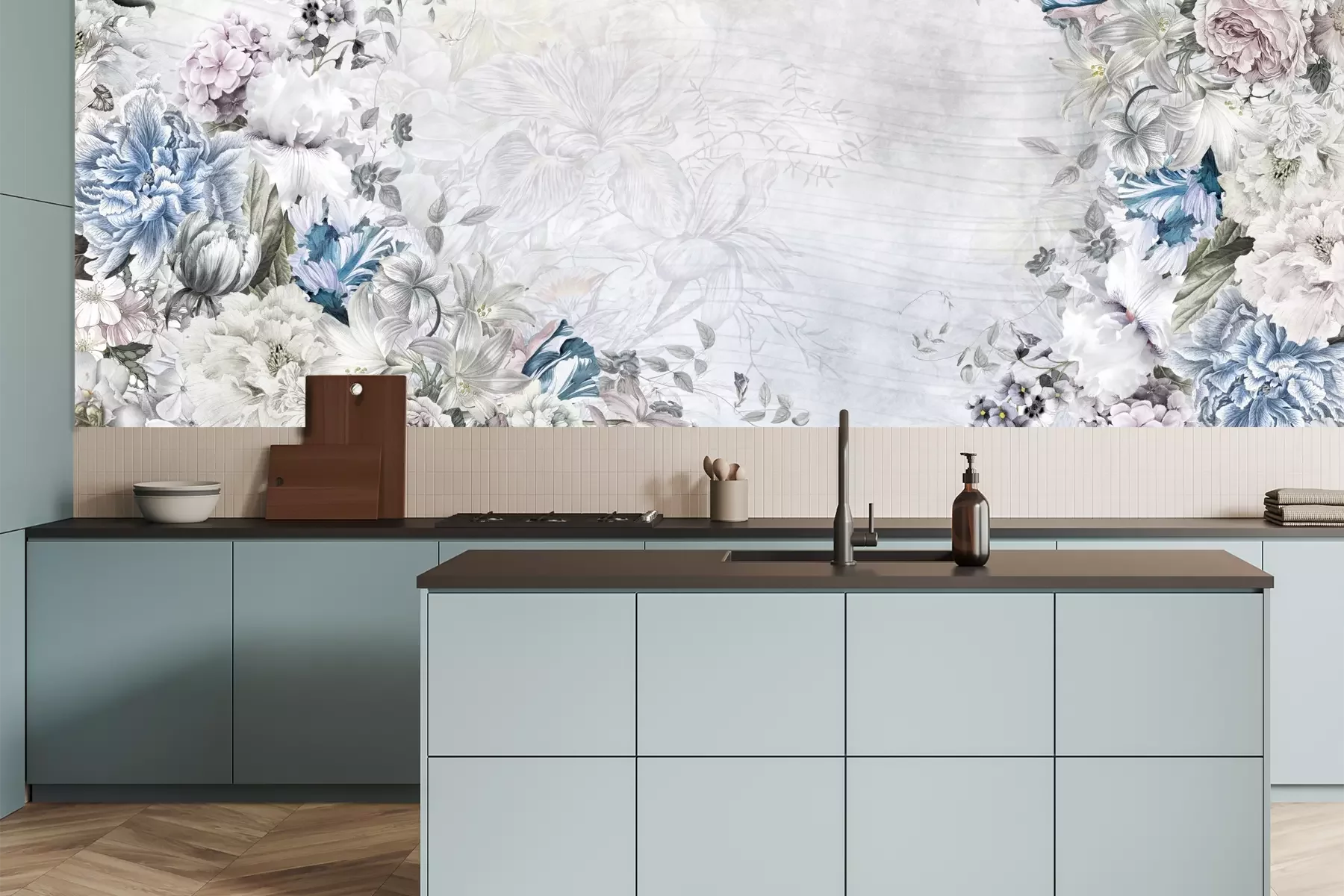 Het materiaal Premium is een glad vinyl op vlies, dat bestand is tegen uitrekken en vervorming. Het is dampdoorlatend – de muren kunnen vrij ademen – waardoor het geschikt is voor gebruik in de keuken en badkamer. Bij vervuiling kan het materiaal worden afgenomen met een vochtige doek. De maximale breedte van één baan bedraagt 95 of 105 cm, afhankelijk van de beschikbaarheid. Montage vindt plaats met de rand-aan-rand methode, wat een esthetisch resultaat zonder zichtbare naden oplevert. Omdat de lijm rechtstreeks op de muur wordt aangebracht, verloopt de installatie van het fotobehang snel en eenvoudig.