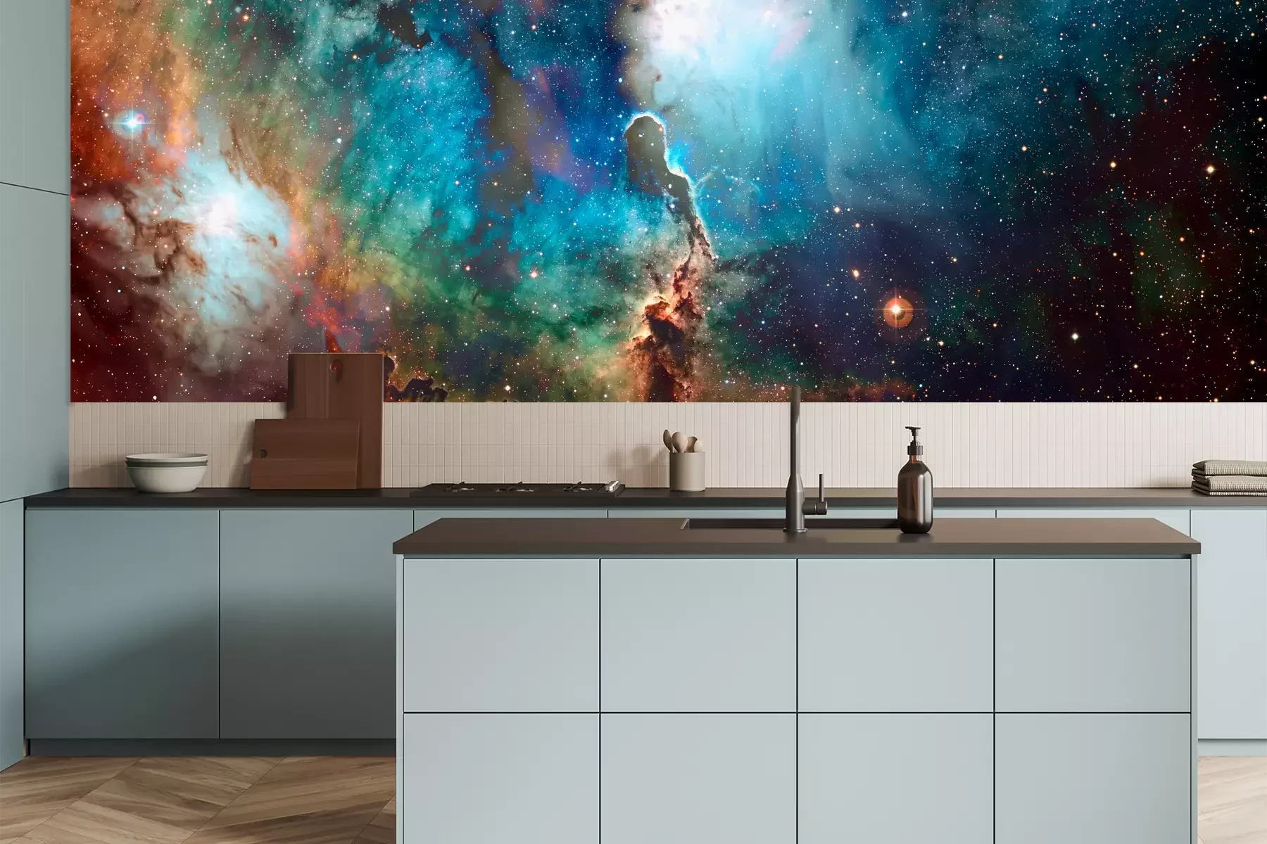 Het materiaal Premium is een glad vinyl op vlies, dat bestand is tegen uitrekken en vervorming. Het is dampdoorlatend – de muren kunnen vrij ademen – waardoor het geschikt is voor gebruik in de keuken en badkamer. Bij vervuiling kan het materiaal worden afgenomen met een vochtige doek. De maximale breedte van één baan bedraagt 95 of 105 cm, afhankelijk van de beschikbaarheid. Montage vindt plaats met de rand-aan-rand methode, wat een esthetisch resultaat zonder zichtbare naden oplevert. Omdat de lijm rechtstreeks op de muur wordt aangebracht, verloopt de installatie van het fotobehang snel en eenvoudig.