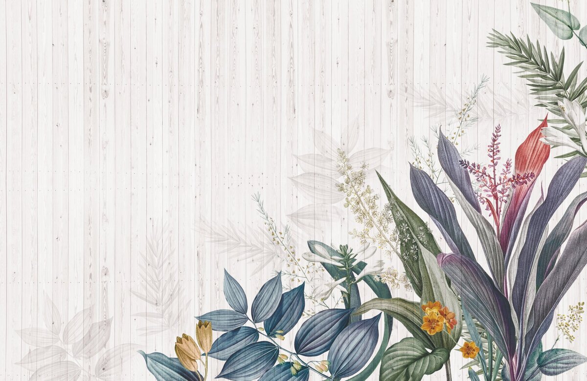 Fotobehang: Kleurrijke tropische bladeren op hout