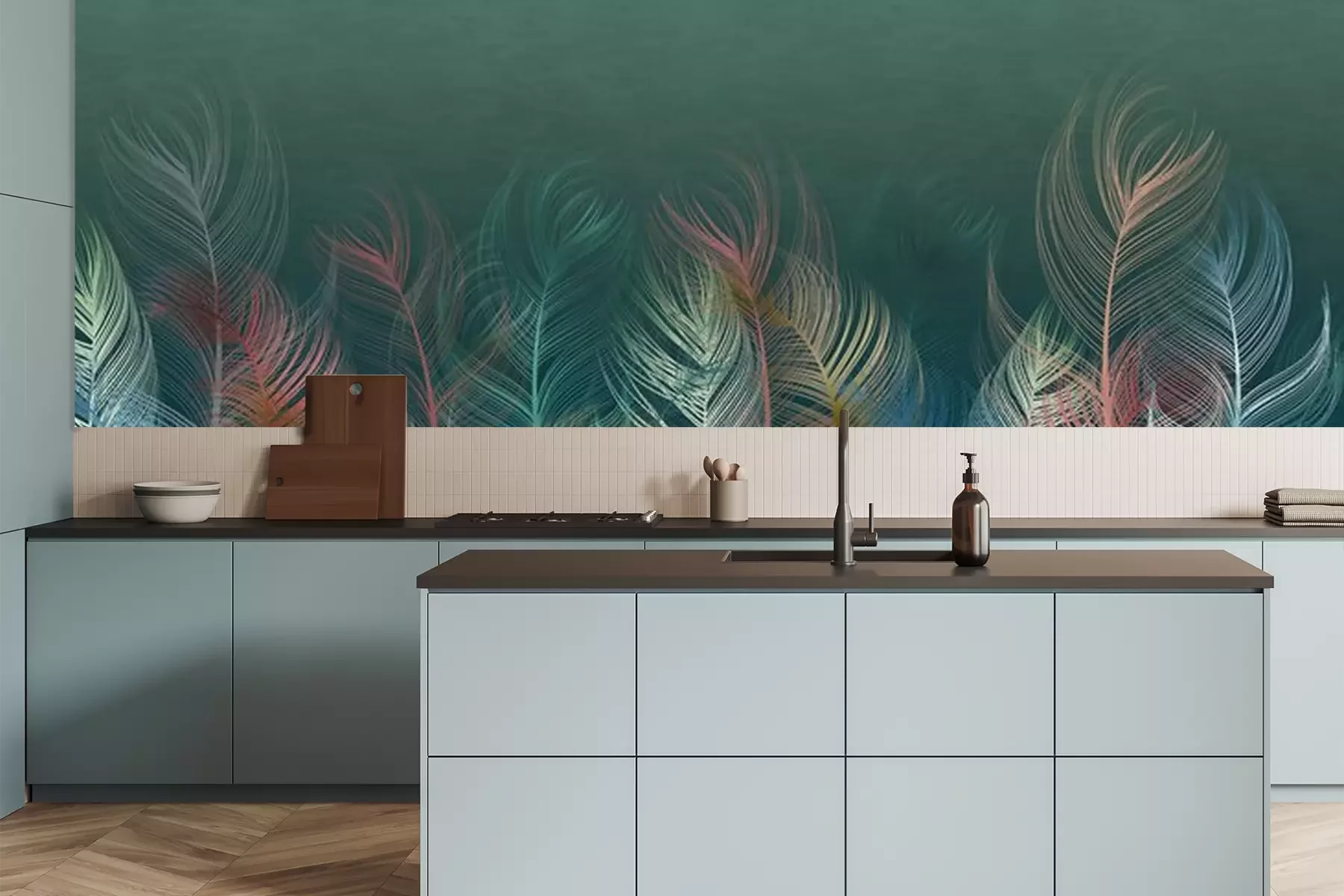 Fotobehang Kleurrijke veren op een groene achtergrond