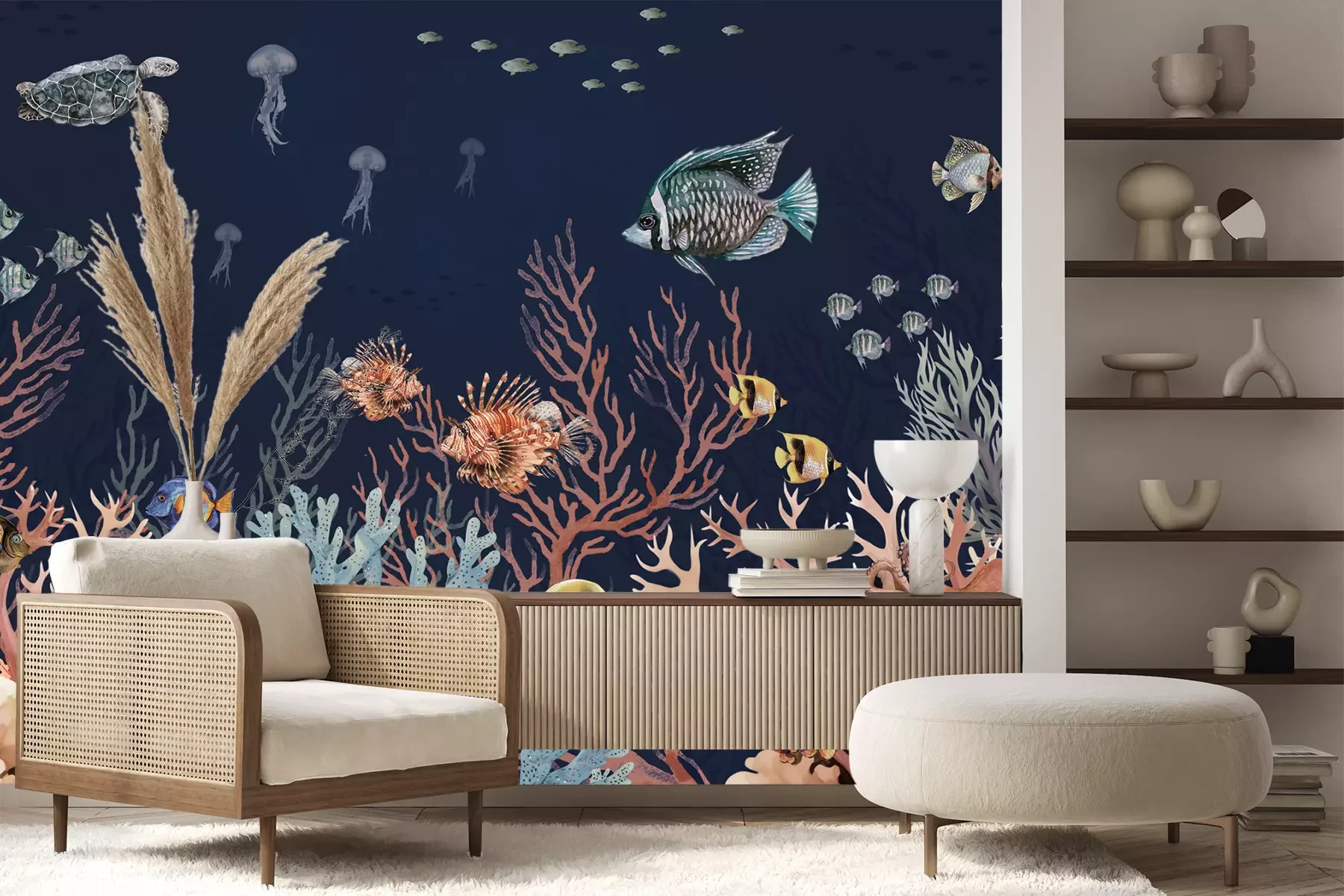 Het materiaal Premium+ is een gestructureerd vinyl op vlies met een gewicht van 255 g/m², dat kleine oneffenheden in de muur effectief camoufleert. De subtiele structuur van fijn zand geeft het oppervlak een exclusieve uitstraling, terwijl de halfmatte afwerking de diepte van de kleuren benadrukt. Het materiaal is dampdoorlatend, waardoor het ook in de keuken en badkamer kan worden gebruikt. De maximale breedte van één baan bedraagt 100 cm – bij grotere afmetingen wordt het fotobehang in meerdere gelijke banen verdeeld. De lijm wordt direct op de muur aangebracht en het behang wordt rand-aan-rand geplakt, wat zorgt voor een esthetisch resultaat zonder zichtbare naden. Het oppervlak kan gemakkelijk worden schoongemaakt door het voorzichtig af te nemen met een vochtige doek.