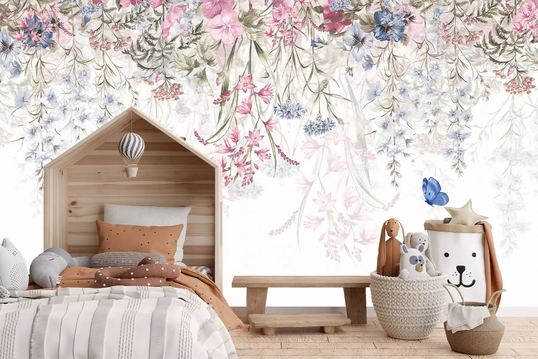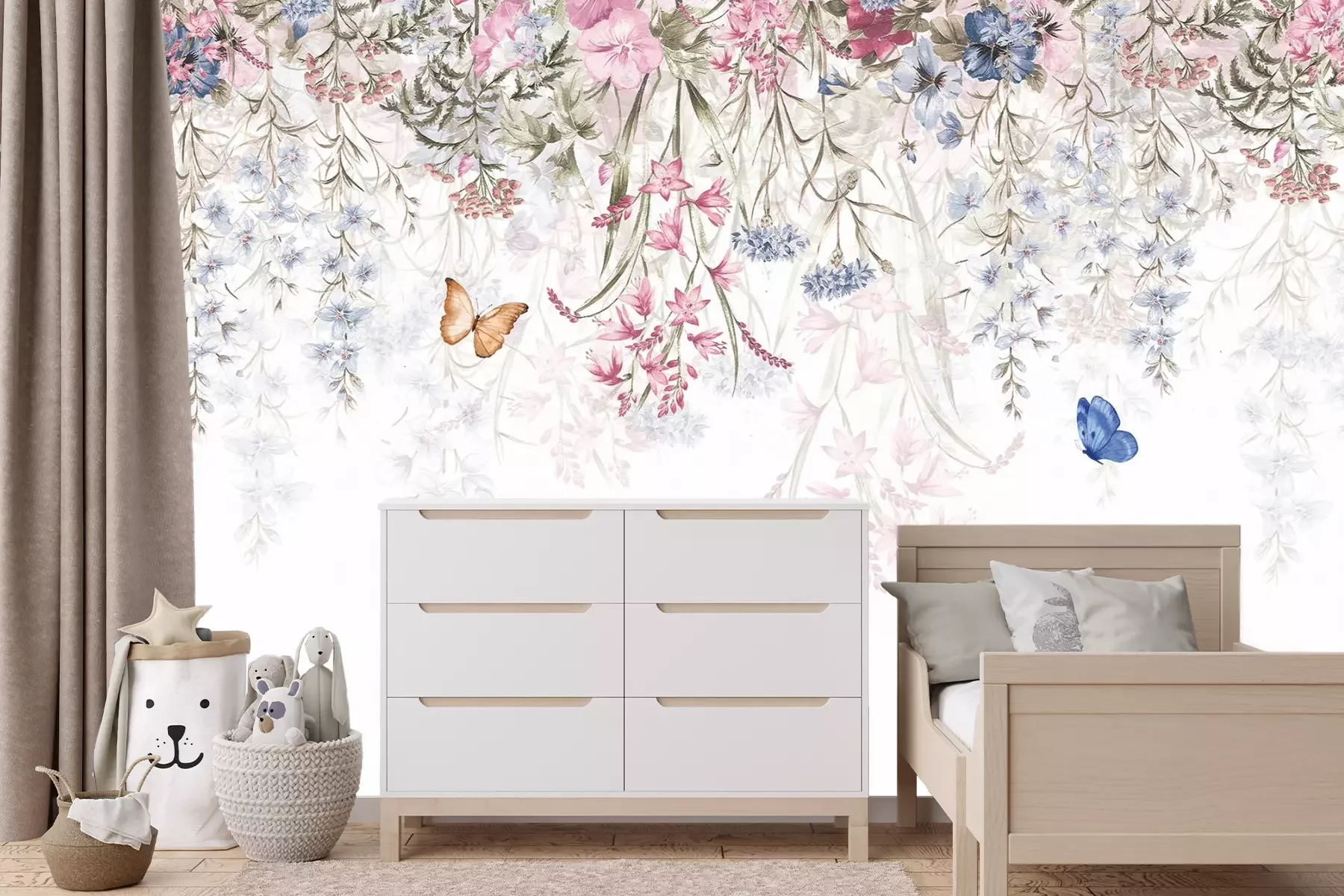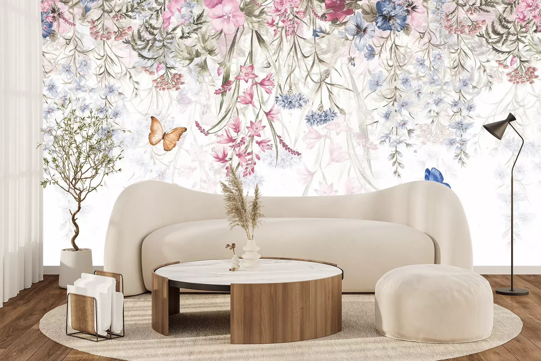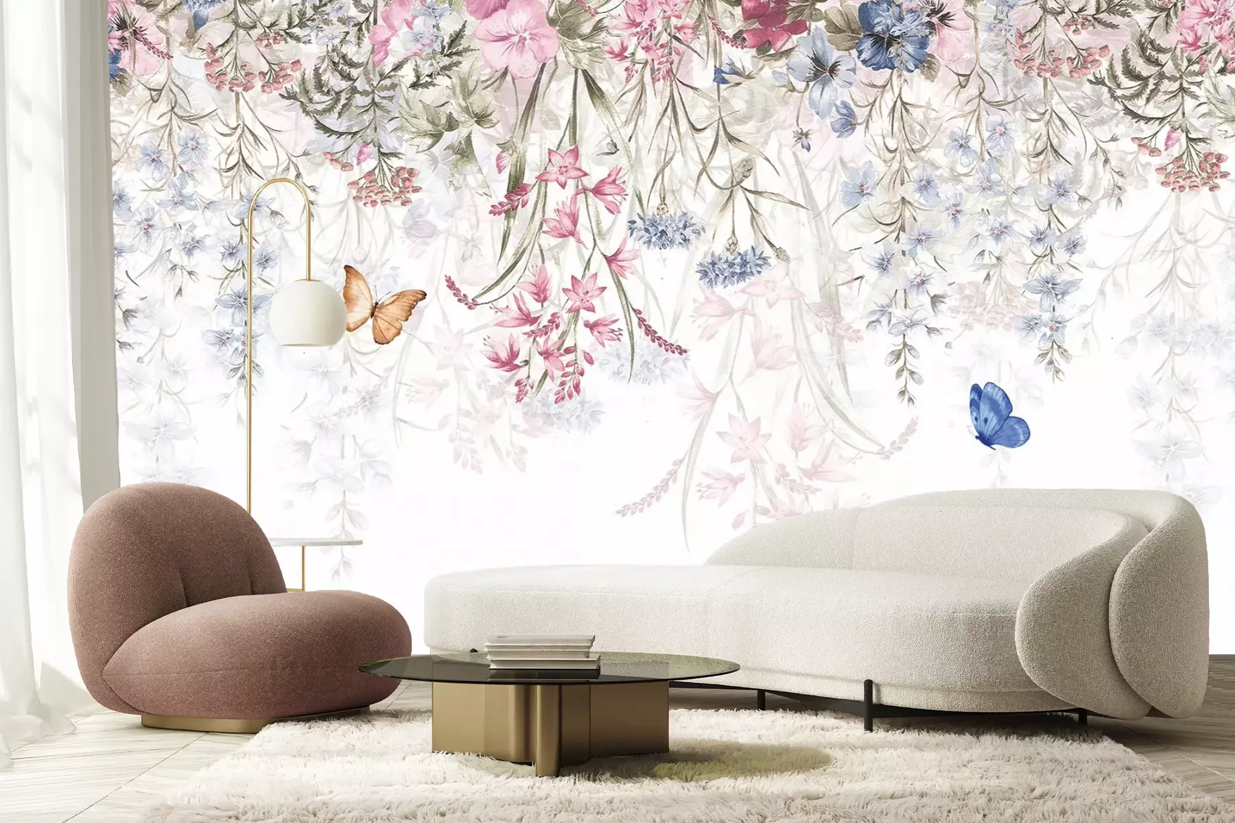 Kleurrijke wilde bloemen hangen aan de bovenkant en vlinders op een witte achtergrond met een botanisch patroon