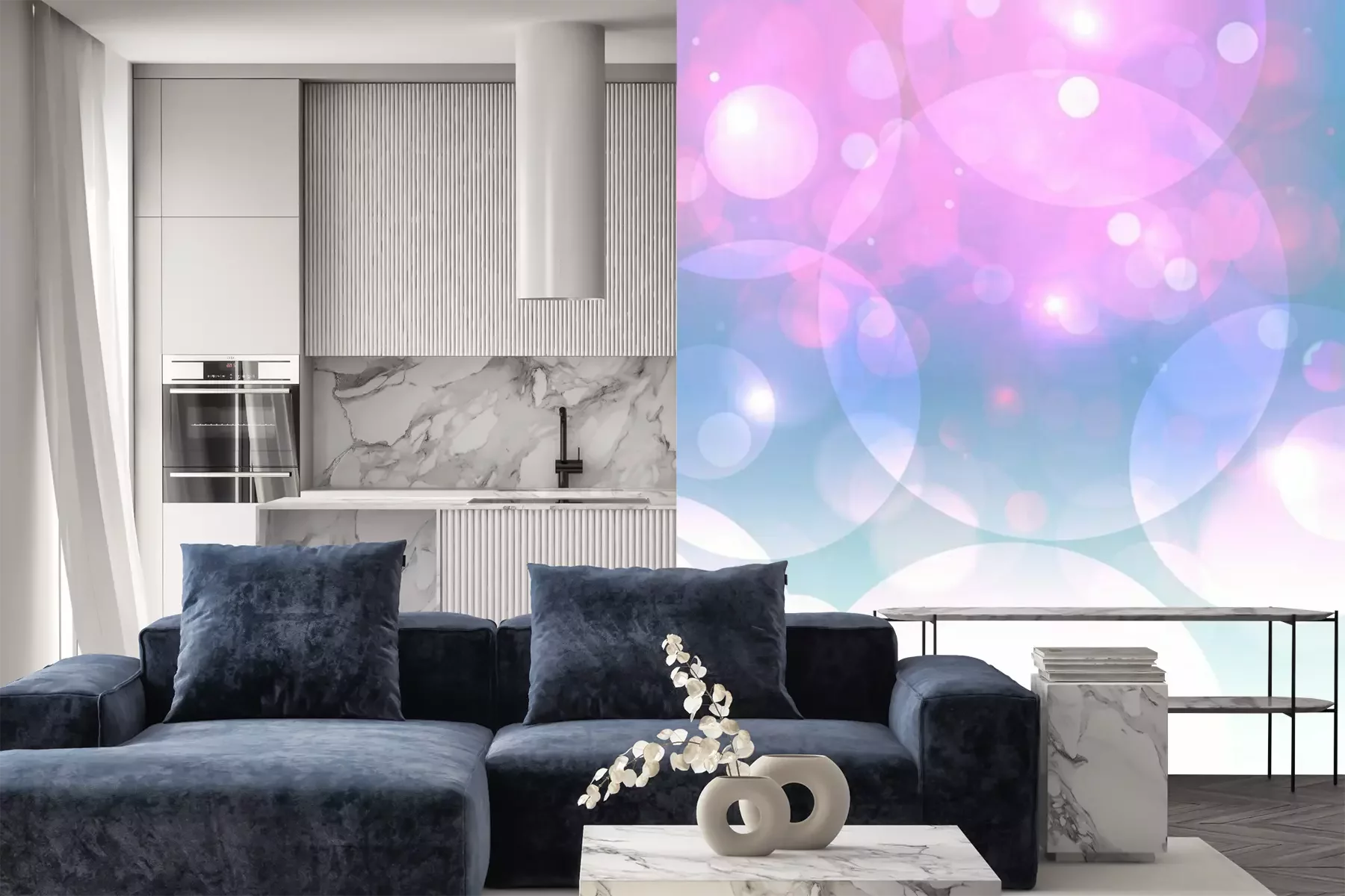 Het materiaal Premium is een glad vinyl op vlies, dat bestand is tegen uitrekken en vervorming. Het is dampdoorlatend – de muren kunnen vrij ademen – waardoor het geschikt is voor gebruik in de keuken en badkamer. Bij vervuiling kan het materiaal worden afgenomen met een vochtige doek. De maximale breedte van één baan bedraagt 95 of 105 cm, afhankelijk van de beschikbaarheid. Montage vindt plaats met de rand-aan-rand methode, wat een esthetisch resultaat zonder zichtbare naden oplevert. Omdat de lijm rechtstreeks op de muur wordt aangebracht, verloopt de installatie van het fotobehang snel en eenvoudig.