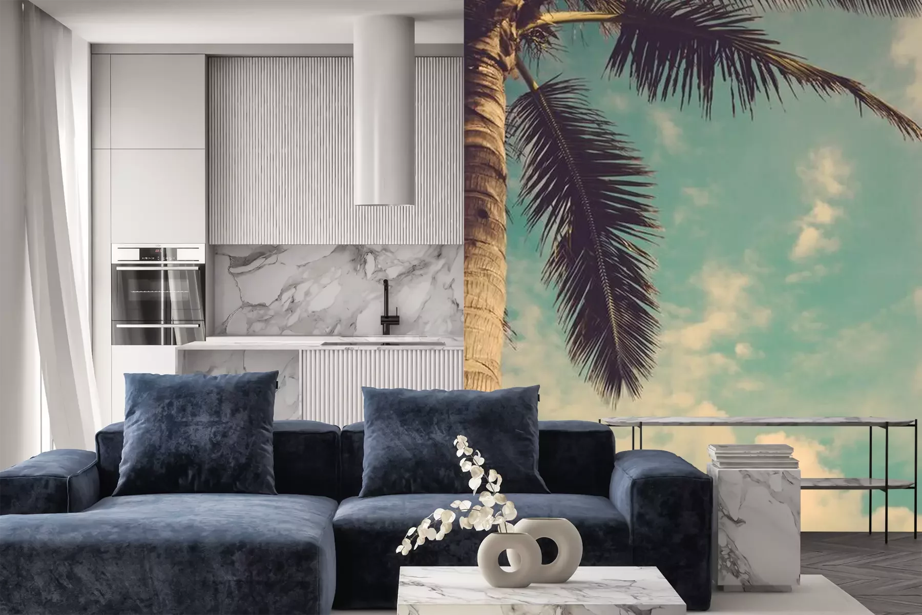 Het materiaal Premium is een glad vinyl op vlies, dat bestand is tegen uitrekken en vervorming. Het is dampdoorlatend – de muren kunnen vrij ademen – waardoor het geschikt is voor gebruik in de keuken en badkamer. Bij vervuiling kan het materiaal worden afgenomen met een vochtige doek. De maximale breedte van één baan bedraagt 95 of 105 cm, afhankelijk van de beschikbaarheid. Montage vindt plaats met de rand-aan-rand methode, wat een esthetisch resultaat zonder zichtbare naden oplevert. Omdat de lijm rechtstreeks op de muur wordt aangebracht, verloopt de installatie van het fotobehang snel en eenvoudig.