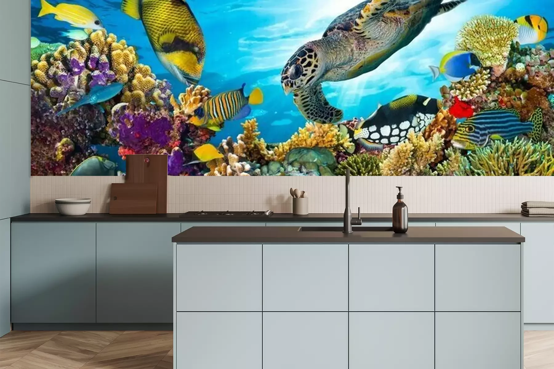 Het materiaal Premium is een glad vinyl op vlies, dat bestand is tegen uitrekken en vervorming. Het is dampdoorlatend – de muren kunnen vrij ademen – waardoor het geschikt is voor gebruik in de keuken en badkamer. Bij vervuiling kan het materiaal worden afgenomen met een vochtige doek. De maximale breedte van één baan bedraagt 95 of 105 cm, afhankelijk van de beschikbaarheid. Montage vindt plaats met de rand-aan-rand methode, wat een esthetisch resultaat zonder zichtbare naden oplevert. Omdat de lijm rechtstreeks op de muur wordt aangebracht, verloopt de installatie van het fotobehang snel en eenvoudig.