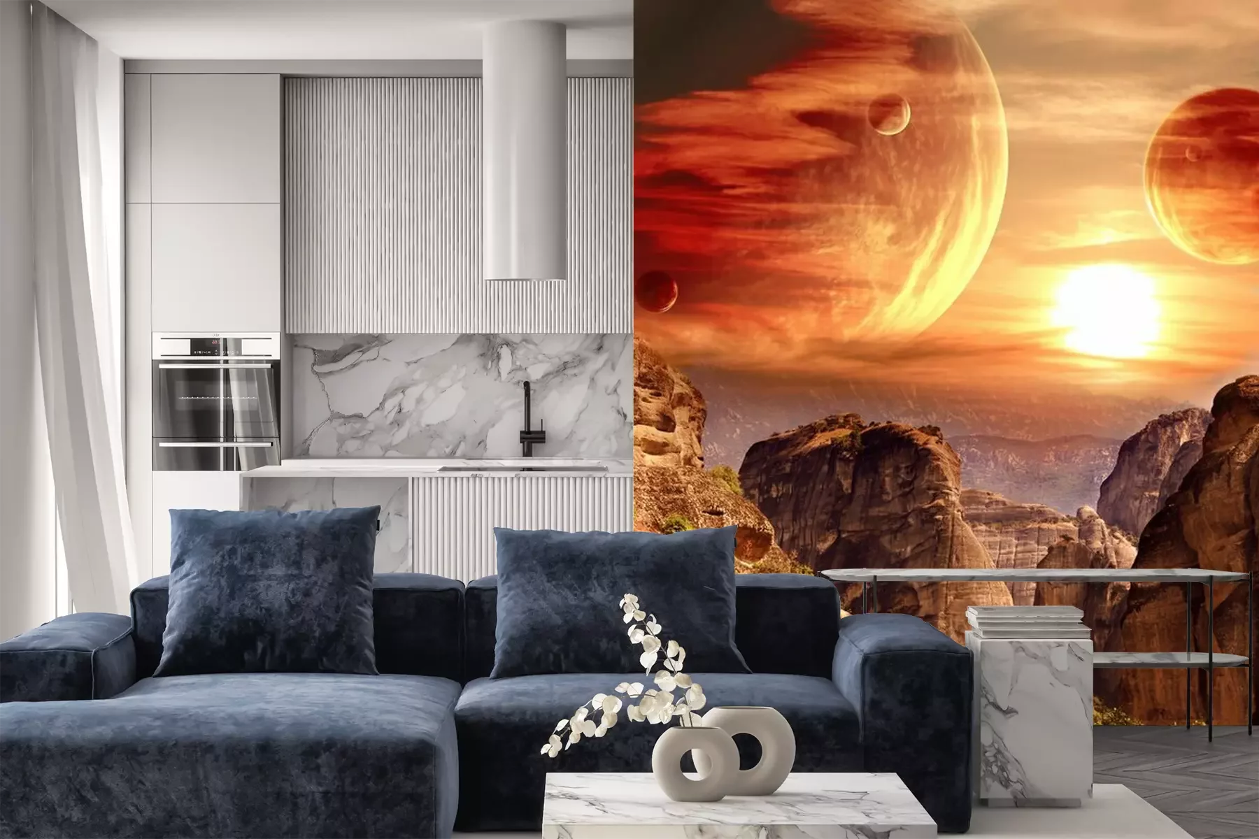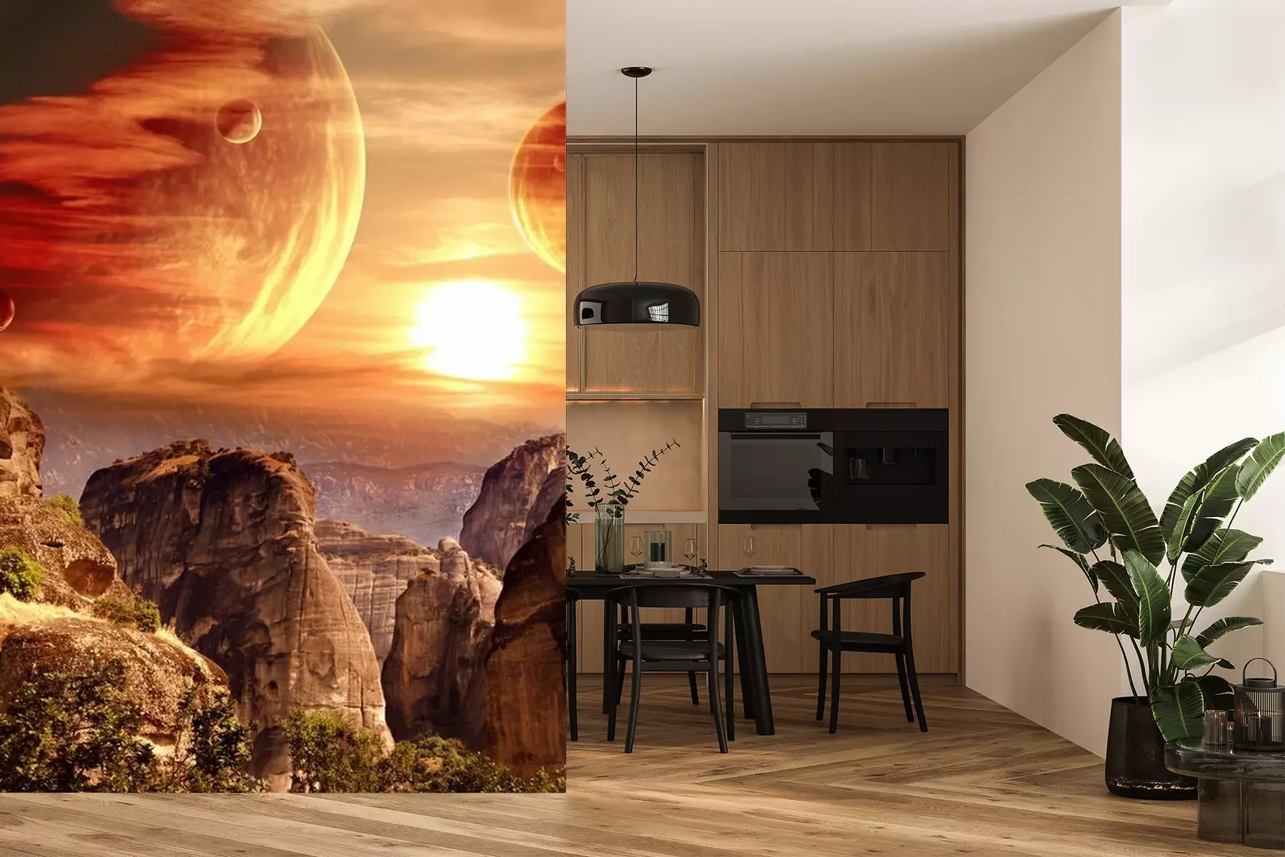 Het materiaal Premium+ is een gestructureerd vinyl op vlies met een gewicht van 255 g/m², dat kleine oneffenheden in de muur effectief camoufleert. De subtiele structuur van fijn zand geeft het oppervlak een exclusieve uitstraling, terwijl de halfmatte afwerking de diepte van de kleuren benadrukt. Het materiaal is dampdoorlatend, waardoor het ook in de keuken en badkamer kan worden gebruikt. De maximale breedte van één baan bedraagt 100 cm – bij grotere afmetingen wordt het fotobehang in meerdere gelijke banen verdeeld. De lijm wordt direct op de muur aangebracht en het behang wordt rand-aan-rand geplakt, wat zorgt voor een esthetisch resultaat zonder zichtbare naden. Het oppervlak kan gemakkelijk worden schoongemaakt door het voorzichtig af te nemen met een vochtige doek.