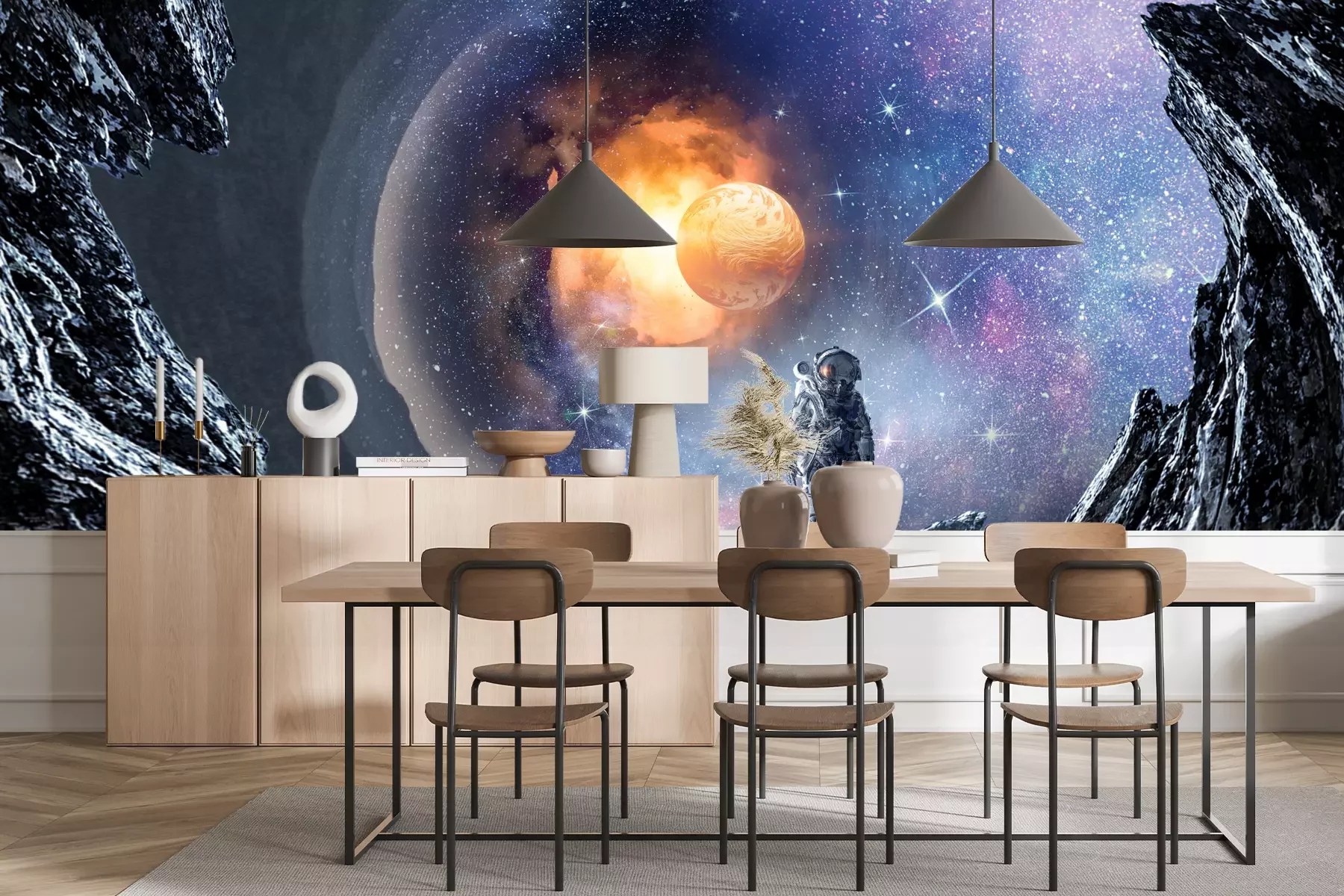 Het materiaal Premium+ is een gestructureerd vinyl op vlies met een gewicht van 255 g/m², dat kleine oneffenheden in de muur effectief camoufleert. De subtiele structuur van fijn zand geeft het oppervlak een exclusieve uitstraling, terwijl de halfmatte afwerking de diepte van de kleuren benadrukt. Het materiaal is dampdoorlatend, waardoor het ook in de keuken en badkamer kan worden gebruikt. De maximale breedte van één baan bedraagt 100 cm – bij grotere afmetingen wordt het fotobehang in meerdere gelijke banen verdeeld. De lijm wordt direct op de muur aangebracht en het behang wordt rand-aan-rand geplakt, wat zorgt voor een esthetisch resultaat zonder zichtbare naden. Het oppervlak kan gemakkelijk worden schoongemaakt door het voorzichtig af te nemen met een vochtige doek.