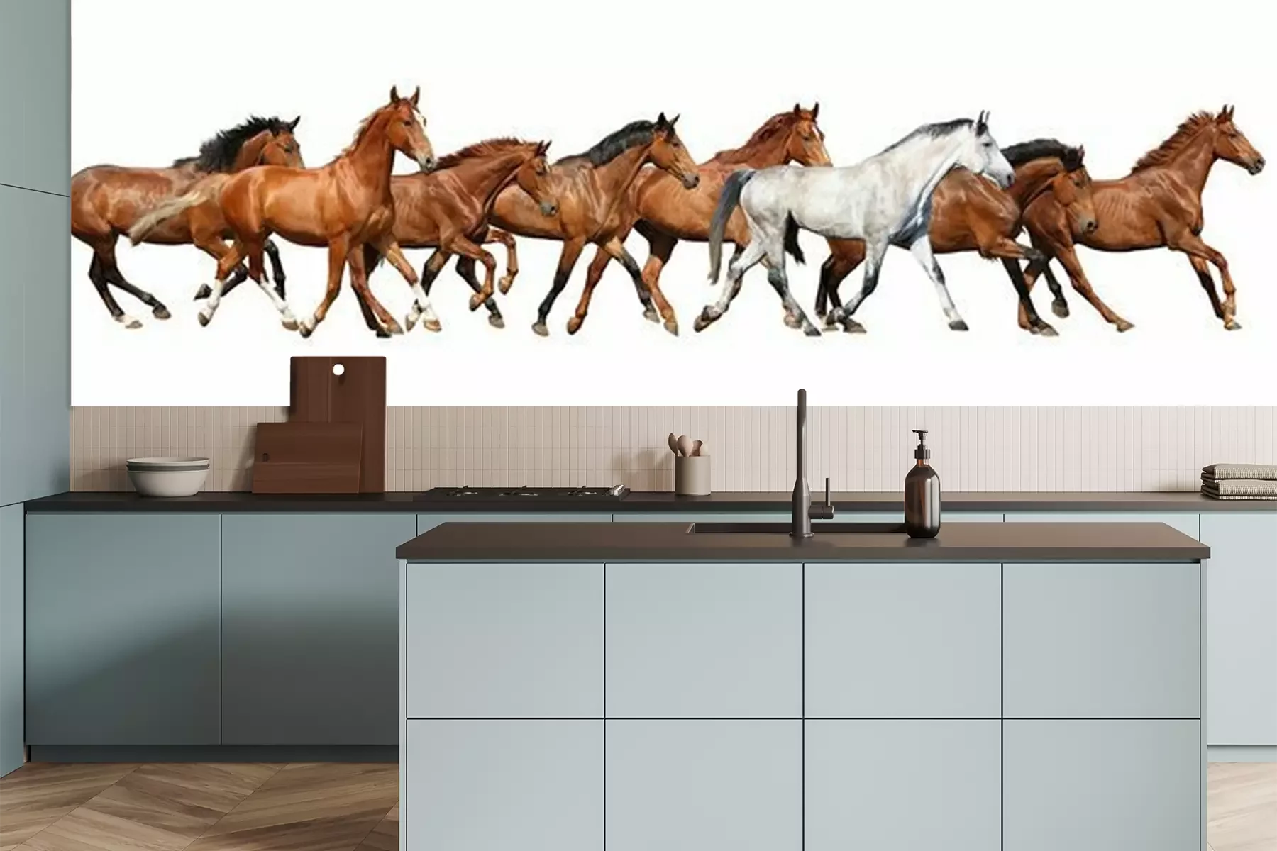 Het materiaal Premium is een glad vinyl op vlies, dat bestand is tegen uitrekken en vervorming. Het is dampdoorlatend – de muren kunnen vrij ademen – waardoor het geschikt is voor gebruik in de keuken en badkamer. Bij vervuiling kan het materiaal worden afgenomen met een vochtige doek. De maximale breedte van één baan bedraagt 95 of 105 cm, afhankelijk van de beschikbaarheid. Montage vindt plaats met de rand-aan-rand methode, wat een esthetisch resultaat zonder zichtbare naden oplevert. Omdat de lijm rechtstreeks op de muur wordt aangebracht, verloopt de installatie van het fotobehang snel en eenvoudig.