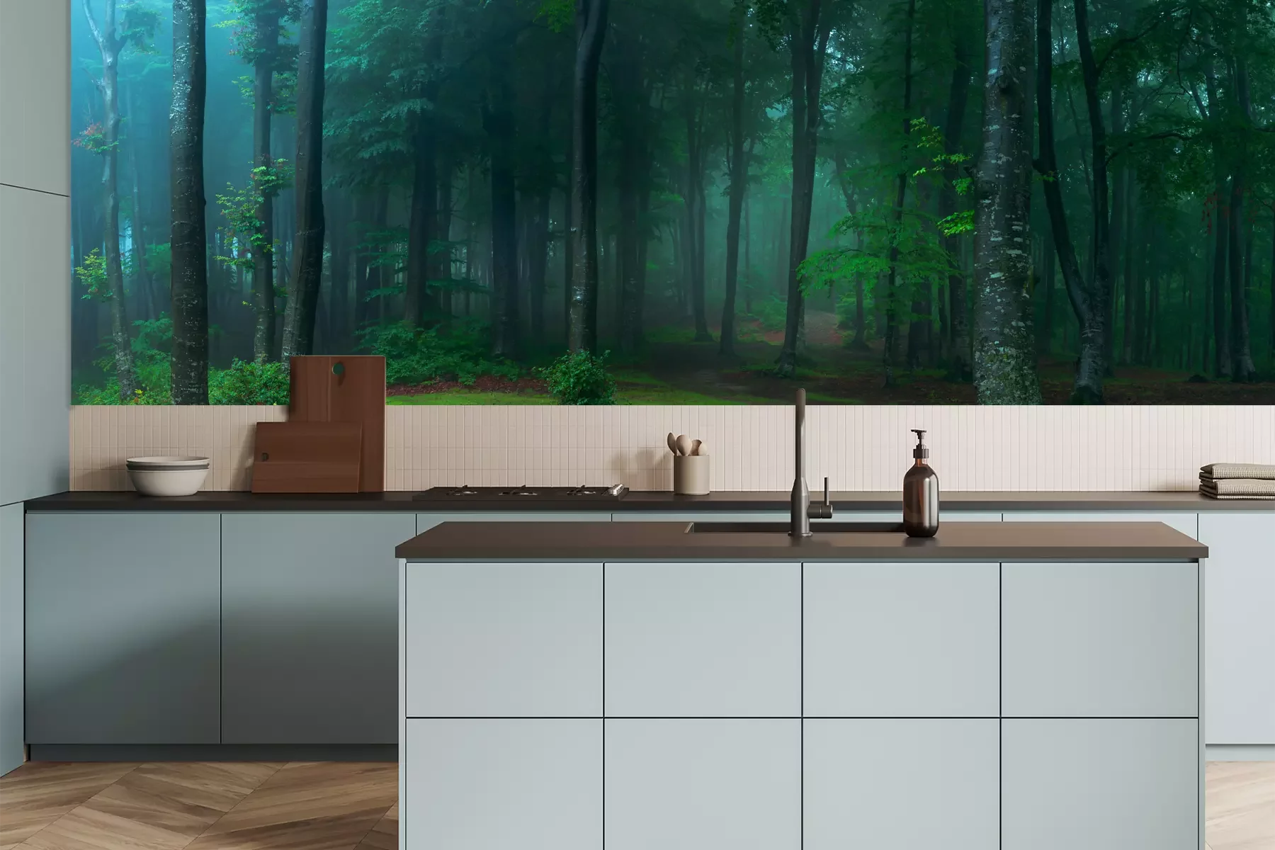 Het materiaal Premium is een glad vinyl op vlies, dat bestand is tegen uitrekken en vervorming. Het is dampdoorlatend – de muren kunnen vrij ademen – waardoor het geschikt is voor gebruik in de keuken en badkamer. Bij vervuiling kan het materiaal worden afgenomen met een vochtige doek. De maximale breedte van één baan bedraagt 95 of 105 cm, afhankelijk van de beschikbaarheid. Montage vindt plaats met de rand-aan-rand methode, wat een esthetisch resultaat zonder zichtbare naden oplevert. Omdat de lijm rechtstreeks op de muur wordt aangebracht, verloopt de installatie van het fotobehang snel en eenvoudig.