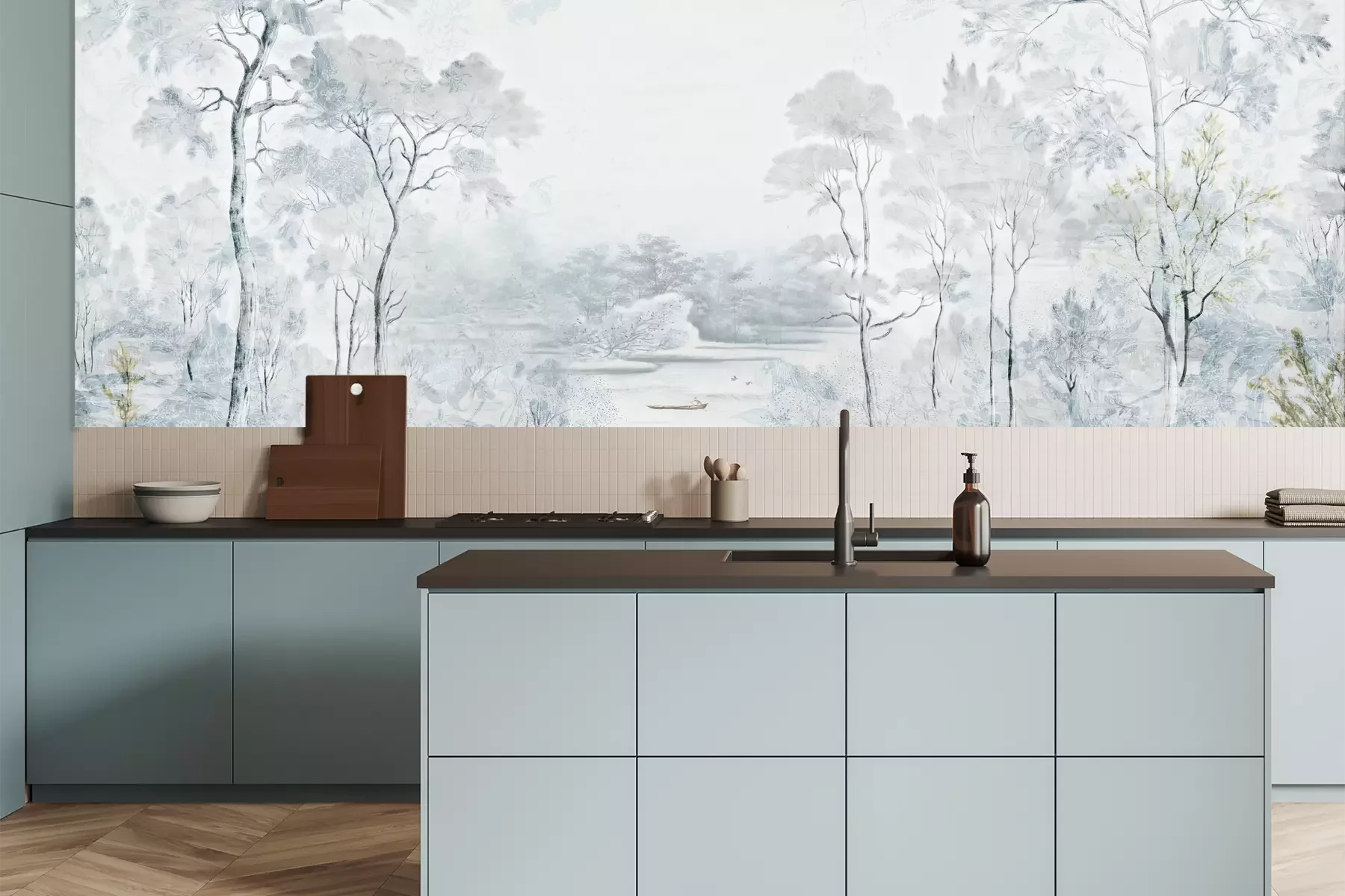 Het materiaal Premium is een glad vinyl op vlies, dat bestand is tegen uitrekken en vervorming. Het is dampdoorlatend – de muren kunnen vrij ademen – waardoor het geschikt is voor gebruik in de keuken en badkamer. Bij vervuiling kan het materiaal worden afgenomen met een vochtige doek. De maximale breedte van één baan bedraagt 95 of 105 cm, afhankelijk van de beschikbaarheid. Montage vindt plaats met de rand-aan-rand methode, wat een esthetisch resultaat zonder zichtbare naden oplevert. Omdat de lijm rechtstreeks op de muur wordt aangebracht, verloopt de installatie van het fotobehang snel en eenvoudig.