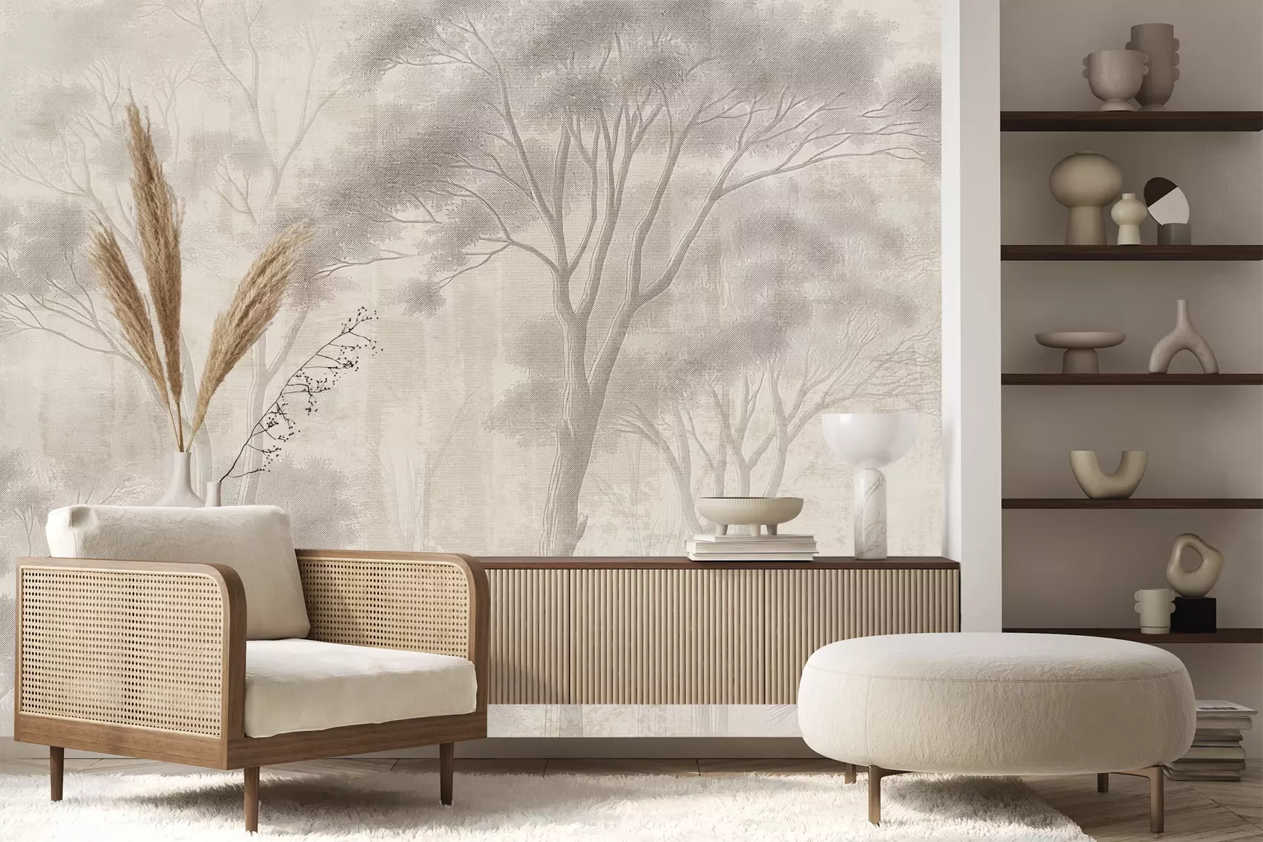Een beige fotobehang met een plantenmotief is een uitstekend voorbeeld van een decoratieve oplossing die het bestaande interieur kan verrijken terwijl het zijn karakter behoudt. De ingetogen, elegante kleurstelling zorgt voor een gezellige sfeer in de ruimte. Het is een veel betere keuze dan een lege, witte muur, die elke ruimte een onpersoonlijk uiterlijk geeft. Het hier gepresenteerde fotobehang boho past bij verschillende interieurstijlen. Het afgebeelde bosmotief zal prachtig staan in een retro-inrichting, omdat de bomen doen denken aan een oude gravure. Het artistieke karakter van de compositie zal perfect harmoniëren met antieke meubels. Het beige fotobehang met een speciaal verouderde textuur is ook een geweldige oplossing voor een kamer in minimal luxury-stijl. Het is elegant, maar op een gebalanceerde en subtiele manier. Het sluit perfect aan bij de tijdloze trend van monochrome interieurs, die gebaseerd zijn op verschillende tinten van dezelfde kleur. Een belangrijk voordeel van dit fotobehang is ook het thema dat het uitbeeldt. Bomen brengen een vleugje natuur in het interieur, waardoor de ruimte een gezellige en aangename uitstraling krijgt. Bovendien doen elementen uit de natuur het altijd goed, waardoor dit fotobehang boho jarenlang een aantrekkelijke decoratie zal zijn. De ingetogen kleurstelling en het natuurlijke motief zullen zeker goed passen in de inrichting van de woonkamer en de slaapkamer, maar niet alleen daar. Het is ook een uitstekende decoratieve oplossing voor een thuiskantoor. Om een werksfeer te creëren die bevorderlijk is voor de productiviteit, is het de moeite waard om te kiezen voor een passend fotobehang. Bos in beige tinten zal niet alleen een elegant decoratief motief zijn, maar ook een rustpunt voor vermoeide ogen, belicht door het licht van het computerscherm. De stijl van het patroon maakt het mogelijk om ons product ook toe te passen in glamour-, eco-, Scandinavische, industriële en minimalistische interieurs, wat dit bijzonder fotobehang veelzijdig maakt. Bomen zorgen ervoor dat je kunt genieten van de nabijheid van de natuur, terwijl ze tegelijkertijd een verfijnd karakter aan de ruimte toevoegen.