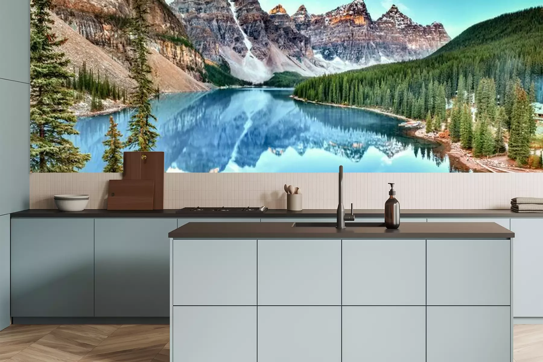 Het materiaal Premium is een glad vinyl op vlies, dat bestand is tegen uitrekken en vervorming. Het is dampdoorlatend – de muren kunnen vrij ademen – waardoor het geschikt is voor gebruik in de keuken en badkamer. Bij vervuiling kan het materiaal worden afgenomen met een vochtige doek. De maximale breedte van één baan bedraagt 95 of 105 cm, afhankelijk van de beschikbaarheid. Montage vindt plaats met de rand-aan-rand methode, wat een esthetisch resultaat zonder zichtbare naden oplevert. Omdat de lijm rechtstreeks op de muur wordt aangebracht, verloopt de installatie van het fotobehang snel en eenvoudig.