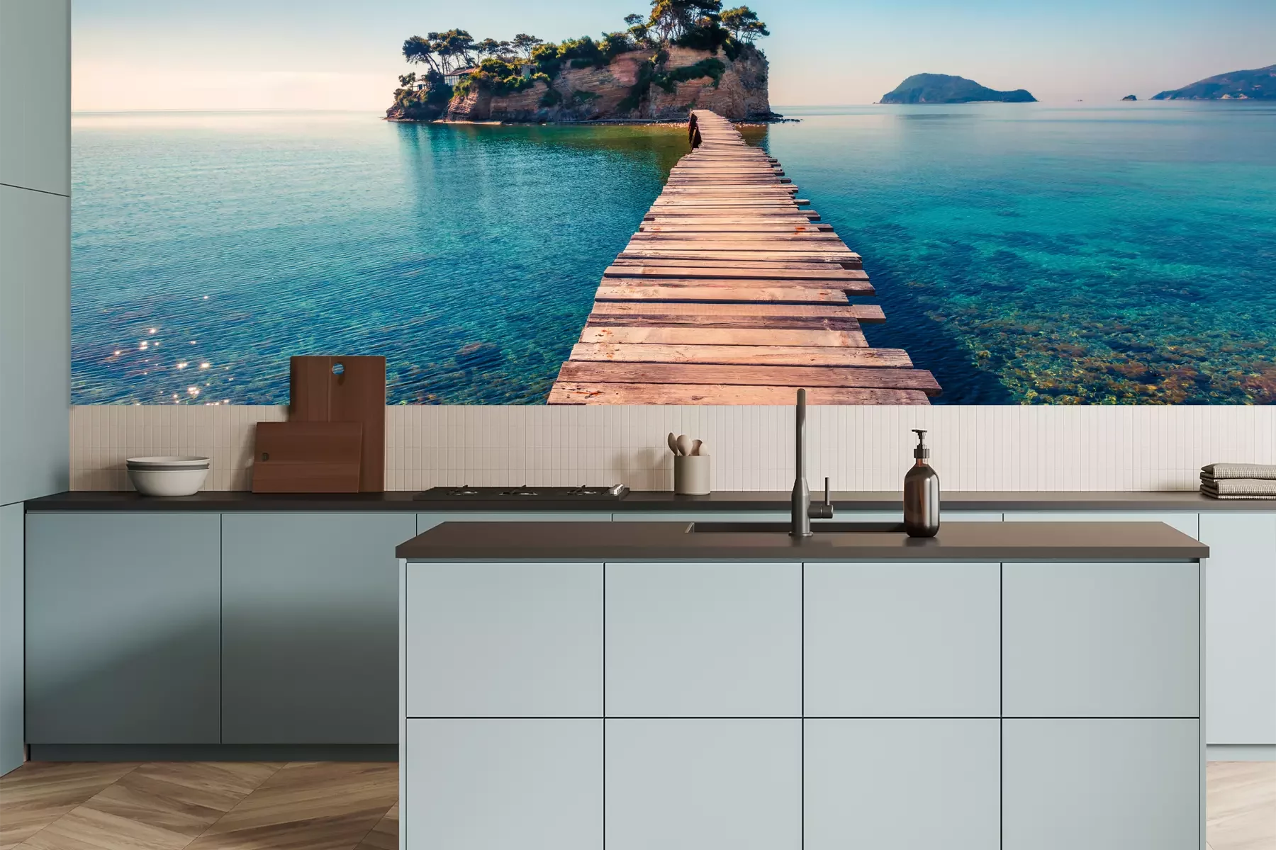 Het materiaal Premium is een glad vinyl op vlies, dat bestand is tegen uitrekken en vervorming. Het is dampdoorlatend – de muren kunnen vrij ademen – waardoor het geschikt is voor gebruik in de keuken en badkamer. Bij vervuiling kan het materiaal worden afgenomen met een vochtige doek. De maximale breedte van één baan bedraagt 95 of 105 cm, afhankelijk van de beschikbaarheid. Montage vindt plaats met de rand-aan-rand methode, wat een esthetisch resultaat zonder zichtbare naden oplevert. Omdat de lijm rechtstreeks op de muur wordt aangebracht, verloopt de installatie van het fotobehang snel en eenvoudig.