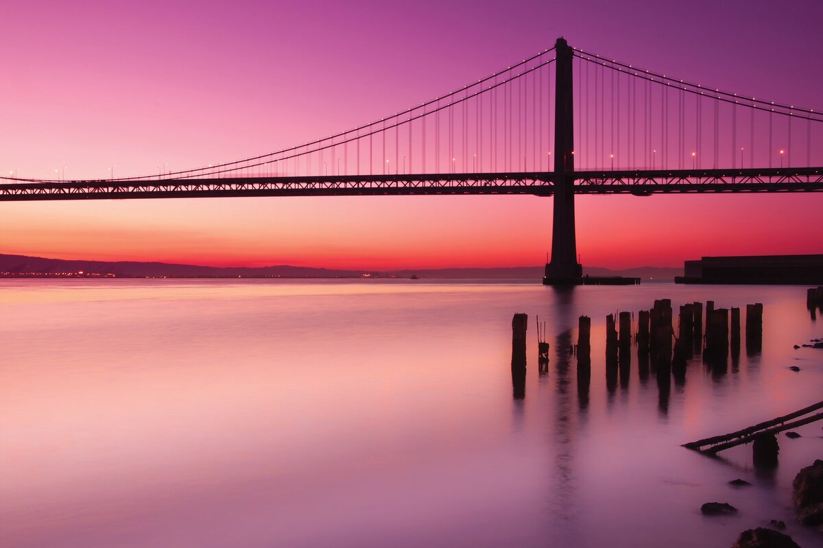Fotobehang: Landschap met een zonsondergang en een brug tegen een roze lucht