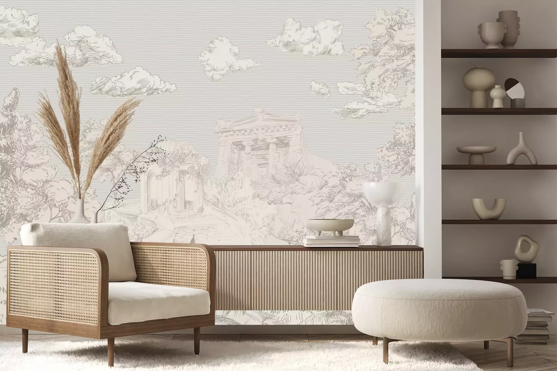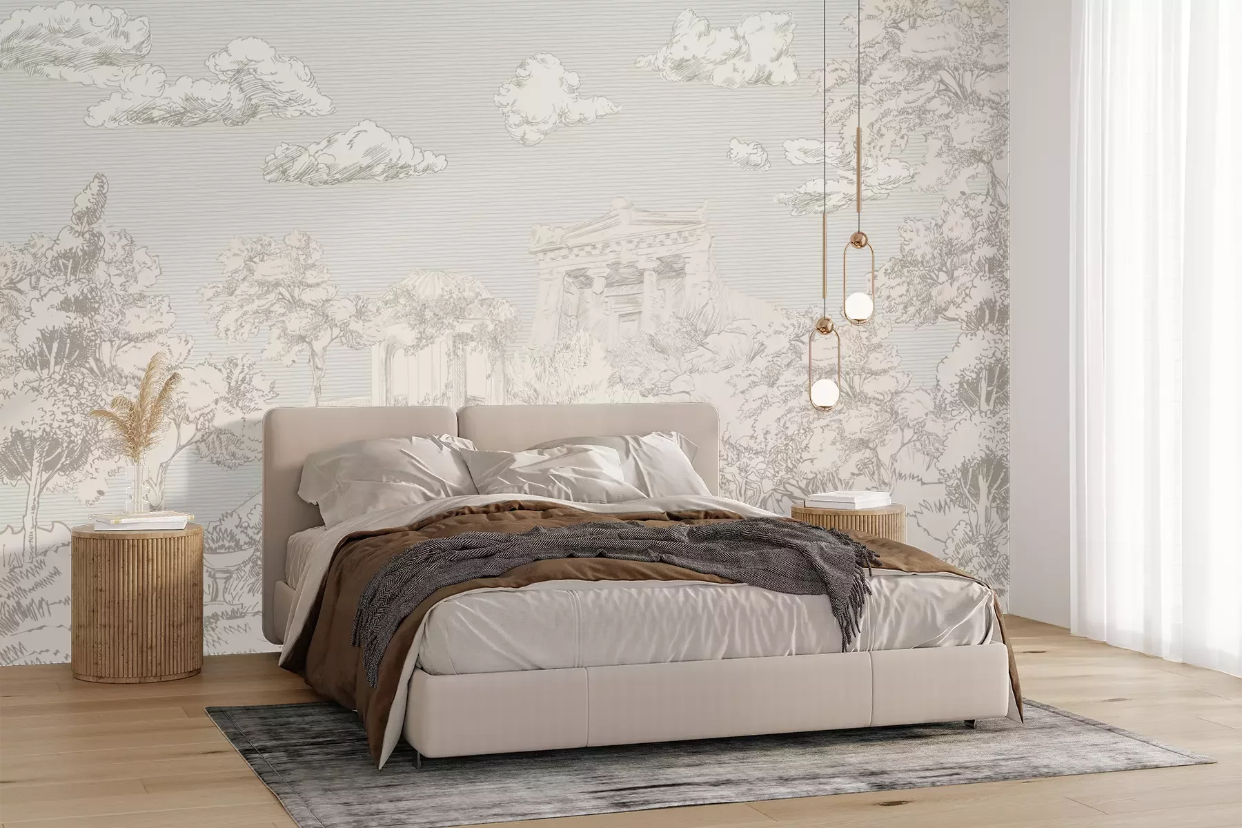 Het materiaal Premium+ is een gestructureerd vinyl op vlies met een gewicht van 255 g/m², dat kleine oneffenheden in de muur effectief camoufleert. De subtiele structuur van fijn zand geeft het oppervlak een exclusieve uitstraling, terwijl de halfmatte afwerking de diepte van de kleuren benadrukt. Het materiaal is dampdoorlatend, waardoor het ook in de keuken en badkamer kan worden gebruikt. De maximale breedte van één baan bedraagt 100 cm – bij grotere afmetingen wordt het fotobehang in meerdere gelijke banen verdeeld. De lijm wordt direct op de muur aangebracht en het behang wordt rand-aan-rand geplakt, wat zorgt voor een esthetisch resultaat zonder zichtbare naden. Het oppervlak kan gemakkelijk worden schoongemaakt door het voorzichtig af te nemen met een vochtige doek.