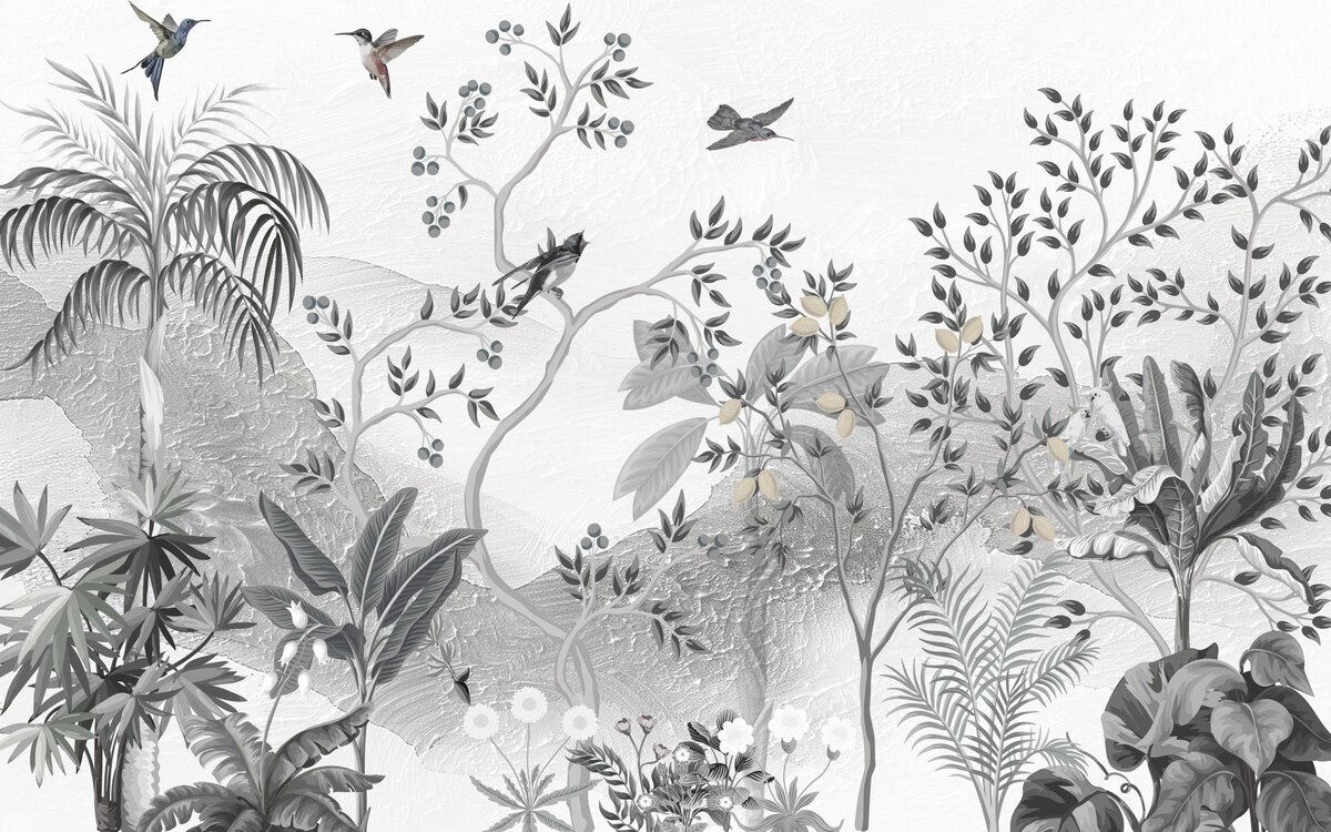 Landschap van bomen en vogels tegen de achtergrond van bergen, muurschildering
