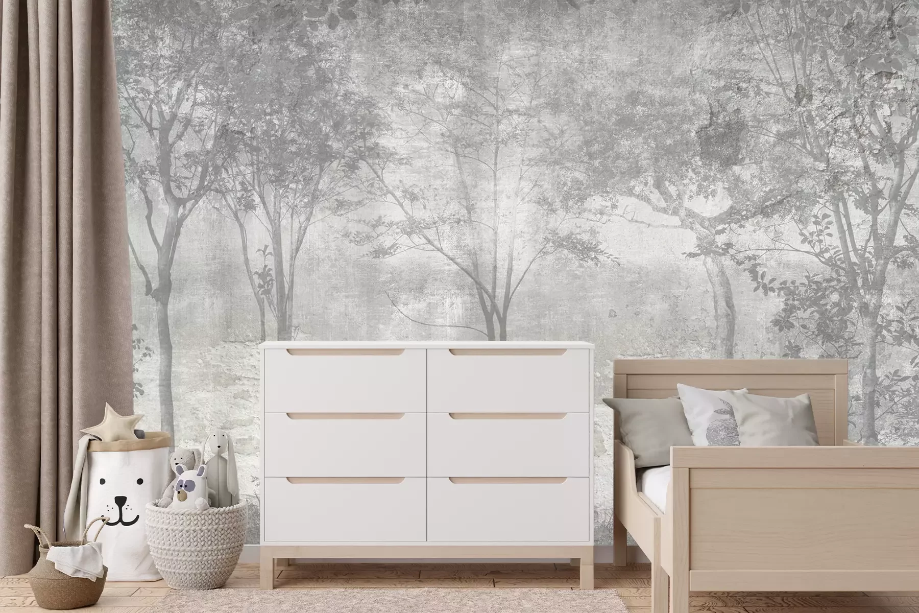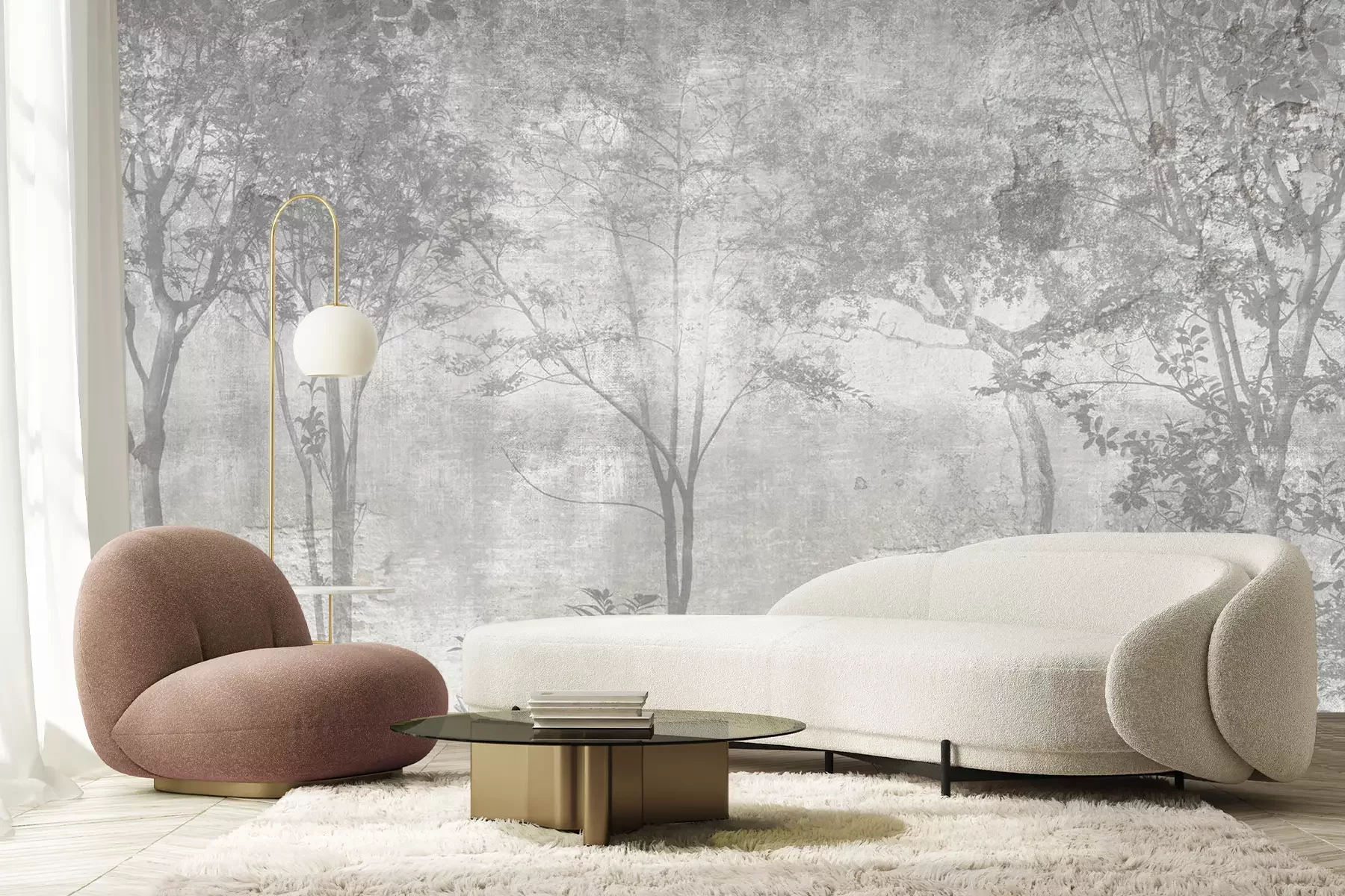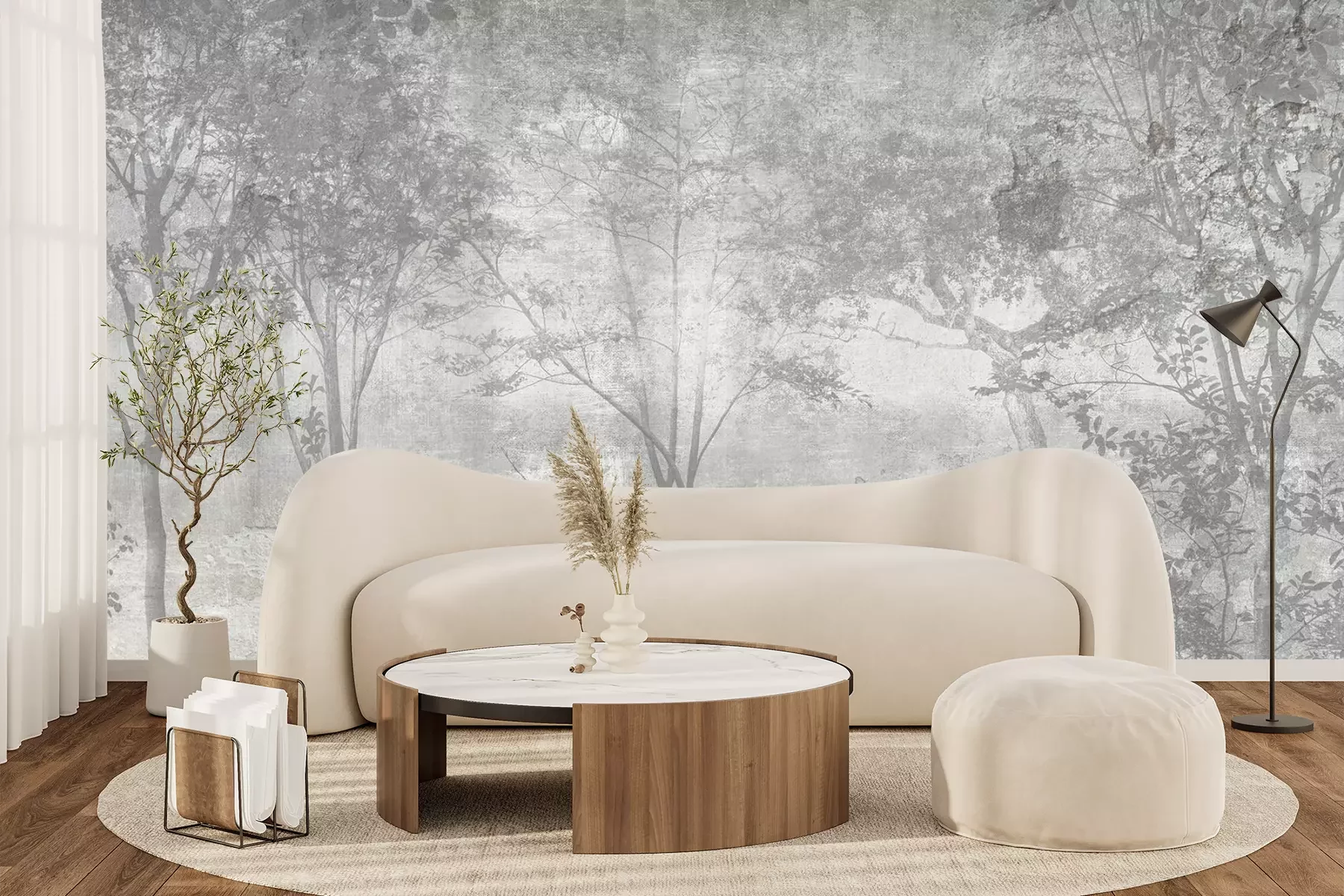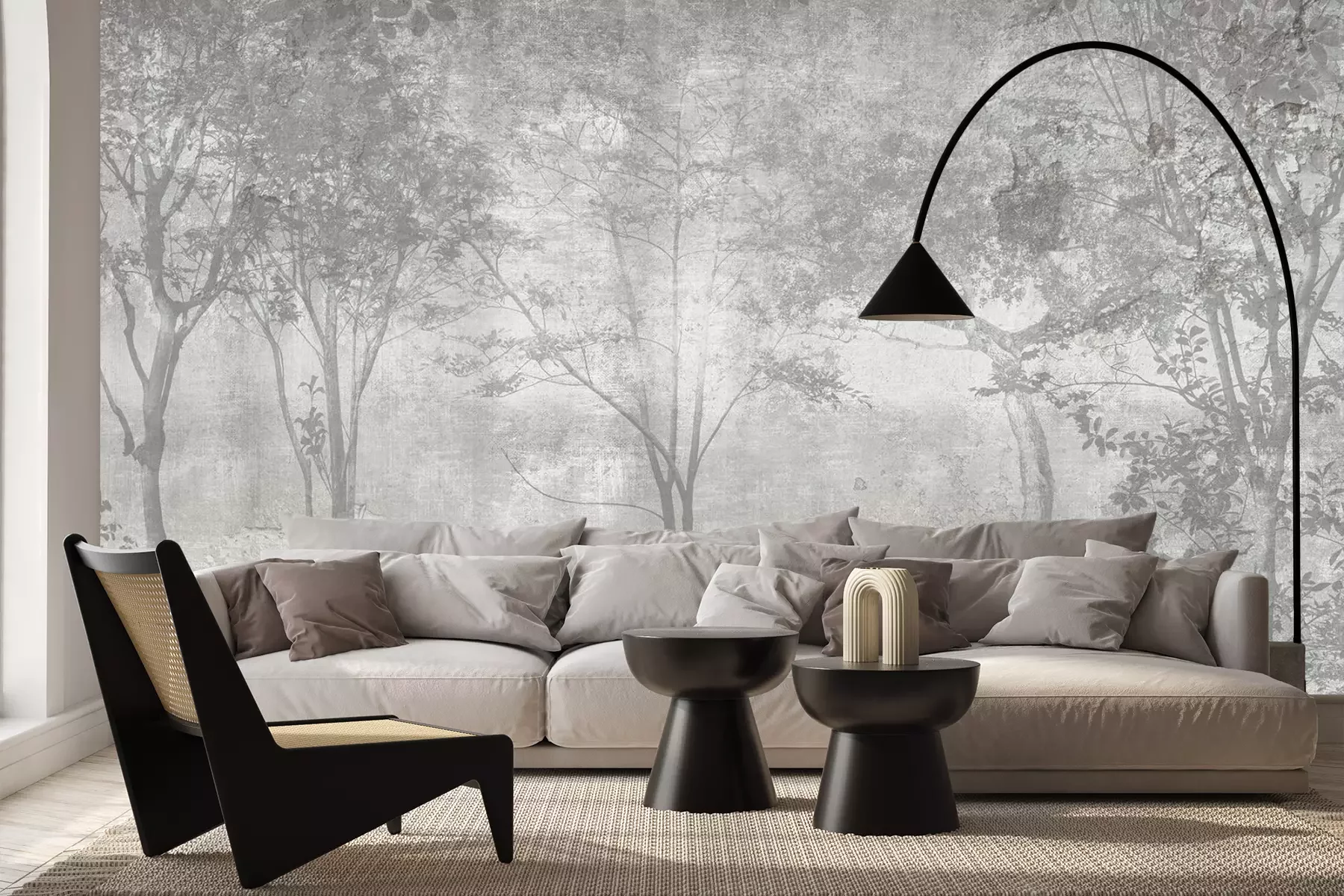 Landschap van een mistig bos en grijze bomen op een ruwe betonnen achtergrond