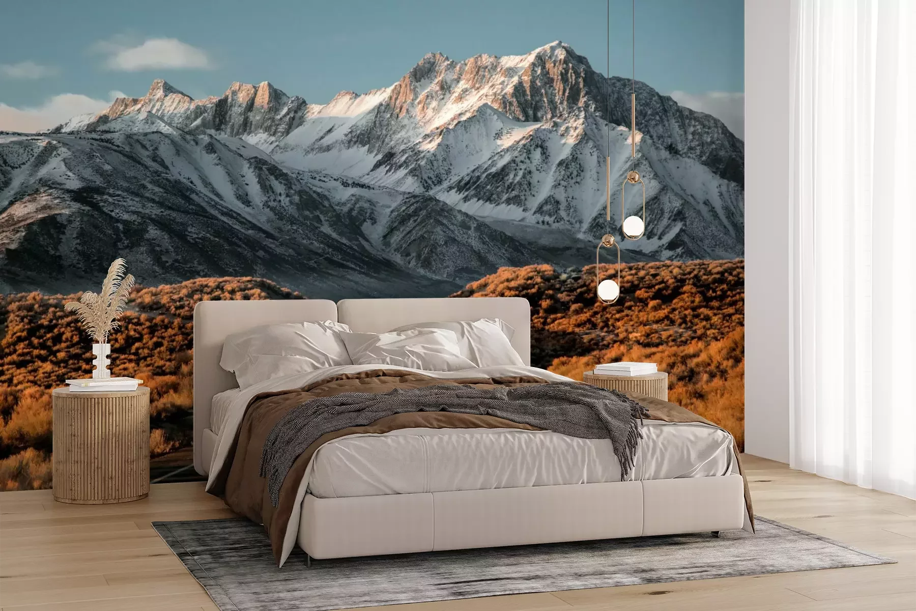 Het materiaal Premium+ is een gestructureerd vinyl op vlies met een gewicht van 255 g/m², dat kleine oneffenheden in de muur effectief camoufleert. De subtiele structuur van fijn zand geeft het oppervlak een exclusieve uitstraling, terwijl de halfmatte afwerking de diepte van de kleuren benadrukt. Het materiaal is dampdoorlatend, waardoor het ook in de keuken en badkamer kan worden gebruikt. De maximale breedte van één baan bedraagt 100 cm – bij grotere afmetingen wordt het fotobehang in meerdere gelijke banen verdeeld. De lijm wordt direct op de muur aangebracht en het behang wordt rand-aan-rand geplakt, wat zorgt voor een esthetisch resultaat zonder zichtbare naden. Het oppervlak kan gemakkelijk worden schoongemaakt door het voorzichtig af te nemen met een vochtige doek.
