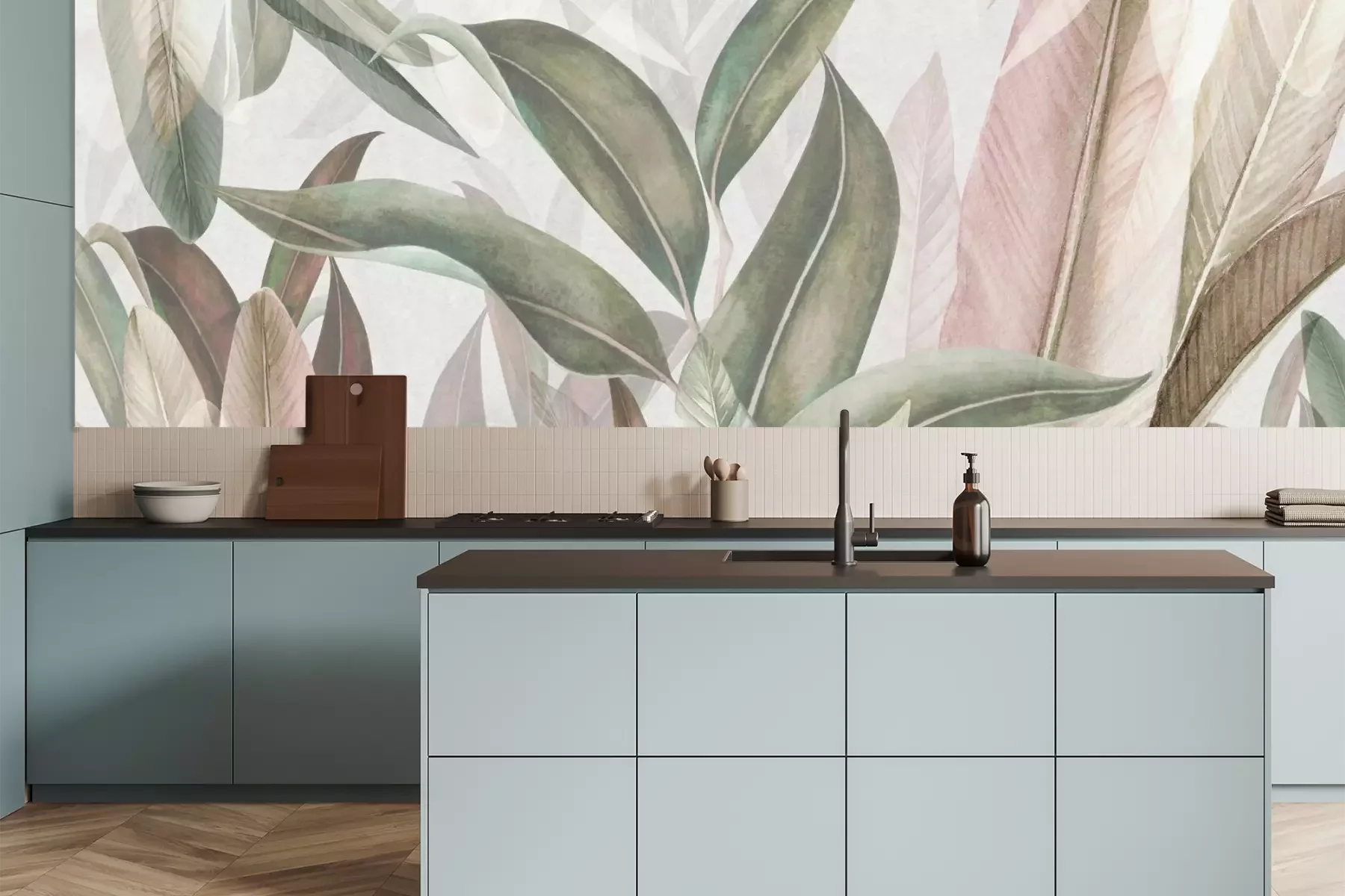 Het materiaal Premium is een glad vinyl op vlies, dat bestand is tegen uitrekken en vervorming. Het is dampdoorlatend – de muren kunnen vrij ademen – waardoor het geschikt is voor gebruik in de keuken en badkamer. Bij vervuiling kan het materiaal worden afgenomen met een vochtige doek. De maximale breedte van één baan bedraagt 95 of 105 cm, afhankelijk van de beschikbaarheid. Montage vindt plaats met de rand-aan-rand methode, wat een esthetisch resultaat zonder zichtbare naden oplevert. Omdat de lijm rechtstreeks op de muur wordt aangebracht, verloopt de installatie van het fotobehang snel en eenvoudig.