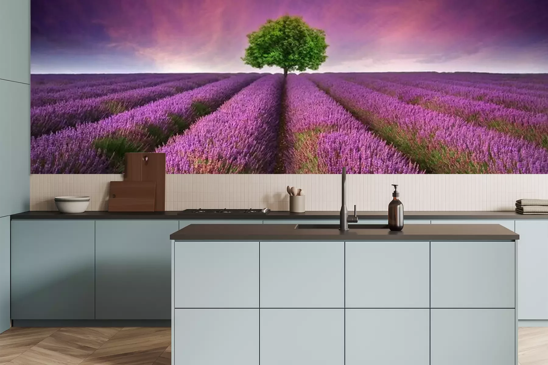 Het materiaal Premium is een glad vinyl op vlies, dat bestand is tegen uitrekken en vervorming. Het is dampdoorlatend – de muren kunnen vrij ademen – waardoor het geschikt is voor gebruik in de keuken en badkamer. Bij vervuiling kan het materiaal worden afgenomen met een vochtige doek. De maximale breedte van één baan bedraagt 95 of 105 cm, afhankelijk van de beschikbaarheid. Montage vindt plaats met de rand-aan-rand methode, wat een esthetisch resultaat zonder zichtbare naden oplevert. Omdat de lijm rechtstreeks op de muur wordt aangebracht, verloopt de installatie van het fotobehang snel en eenvoudig.