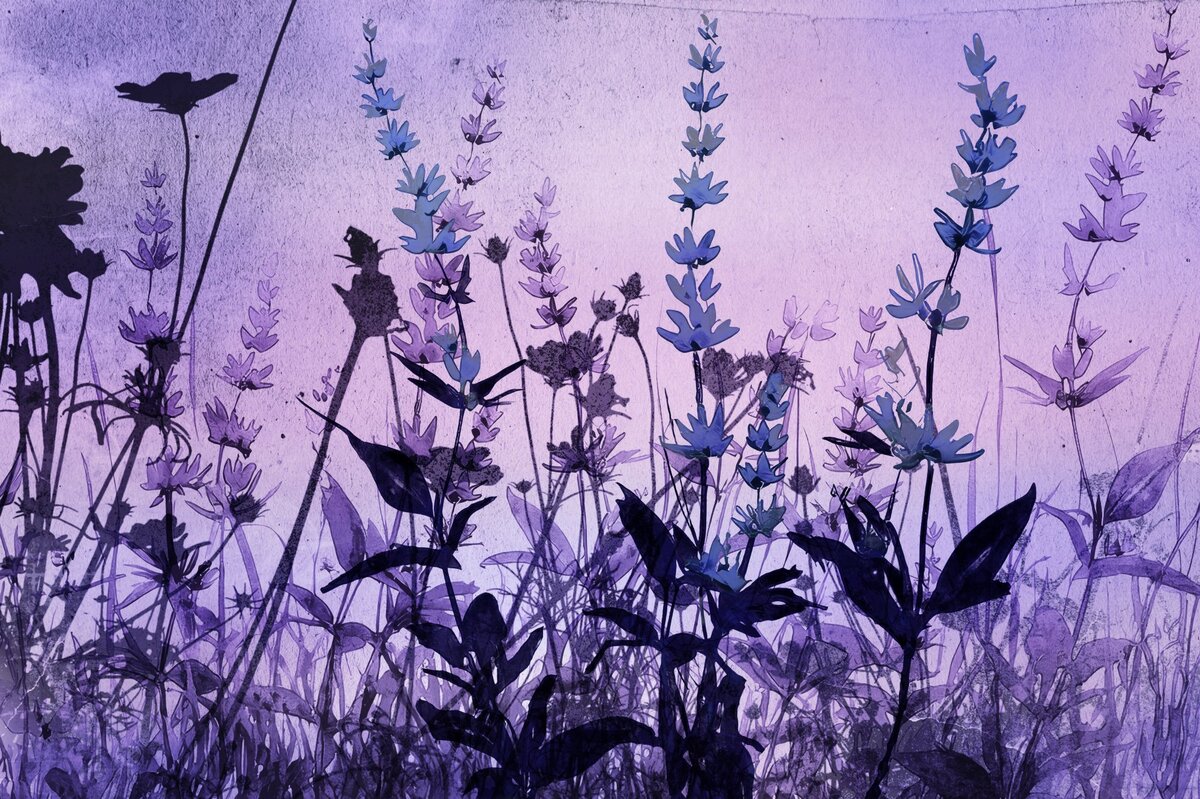 Fotobehang: Lavendelplanten en bloemen op een roze achtergrond