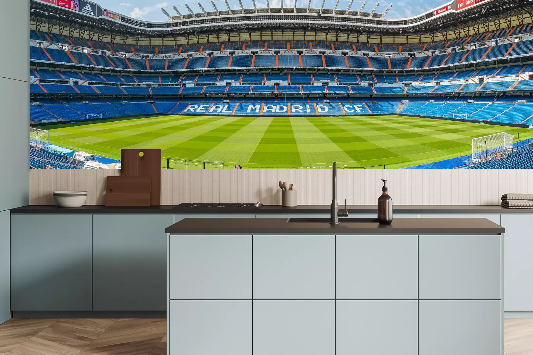 Het materiaal Premium is een glad vinyl op vlies, dat bestand is tegen uitrekken en vervorming. Het is dampdoorlatend – de muren kunnen vrij ademen – waardoor het geschikt is voor gebruik in de keuken en badkamer. Bij vervuiling kan het materiaal worden afgenomen met een vochtige doek. De maximale breedte van één baan bedraagt 95 of 105 cm, afhankelijk van de beschikbaarheid. Montage vindt plaats met de rand-aan-rand methode, wat een esthetisch resultaat zonder zichtbare naden oplevert. Omdat de lijm rechtstreeks op de muur wordt aangebracht, verloopt de installatie van het fotobehang snel en eenvoudig.
