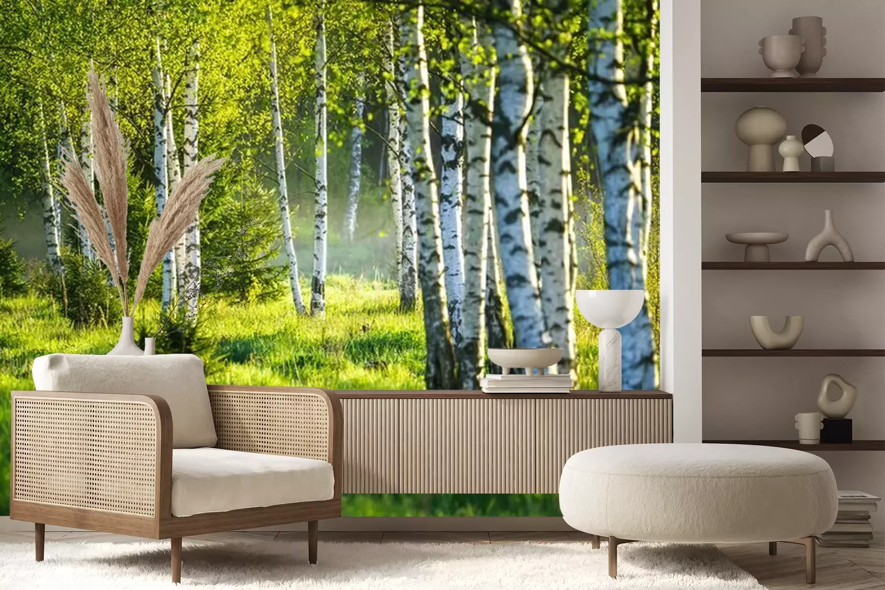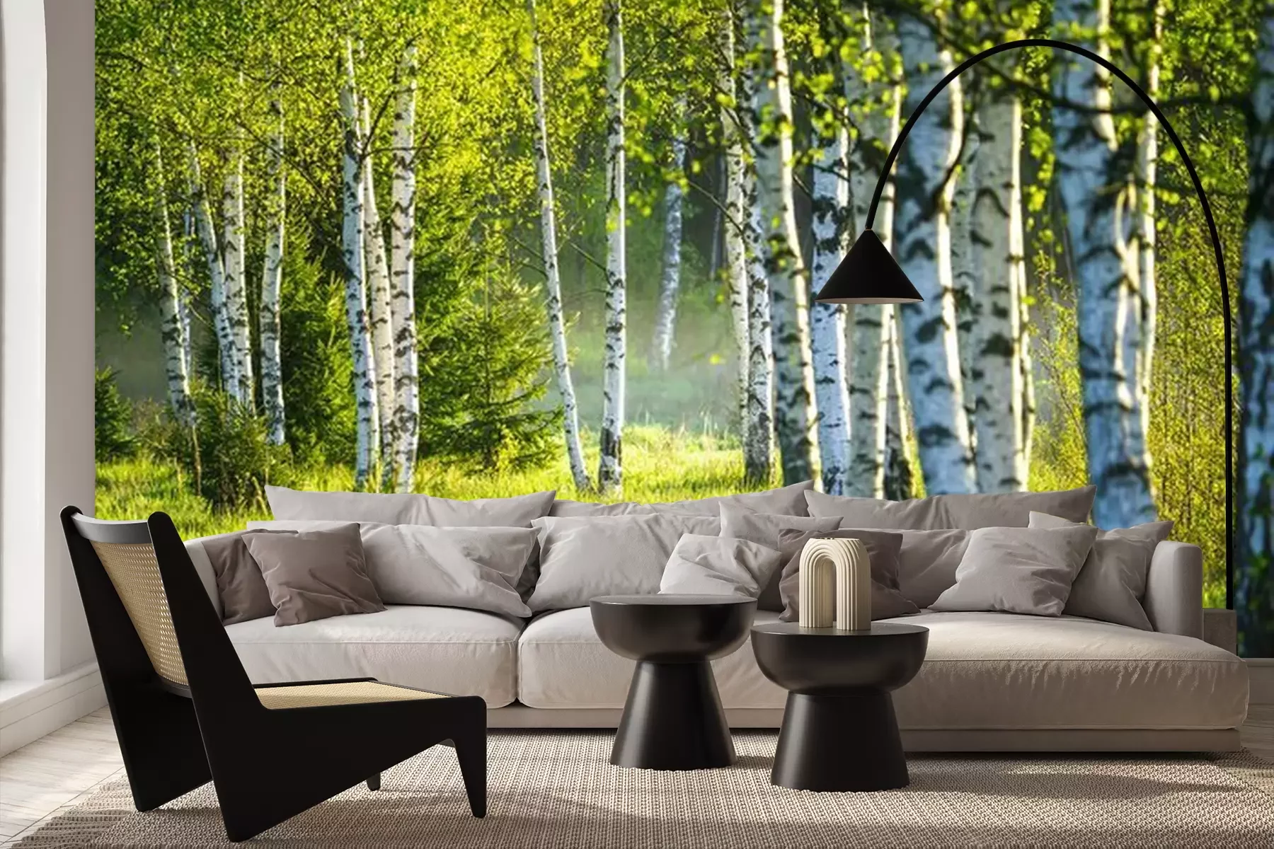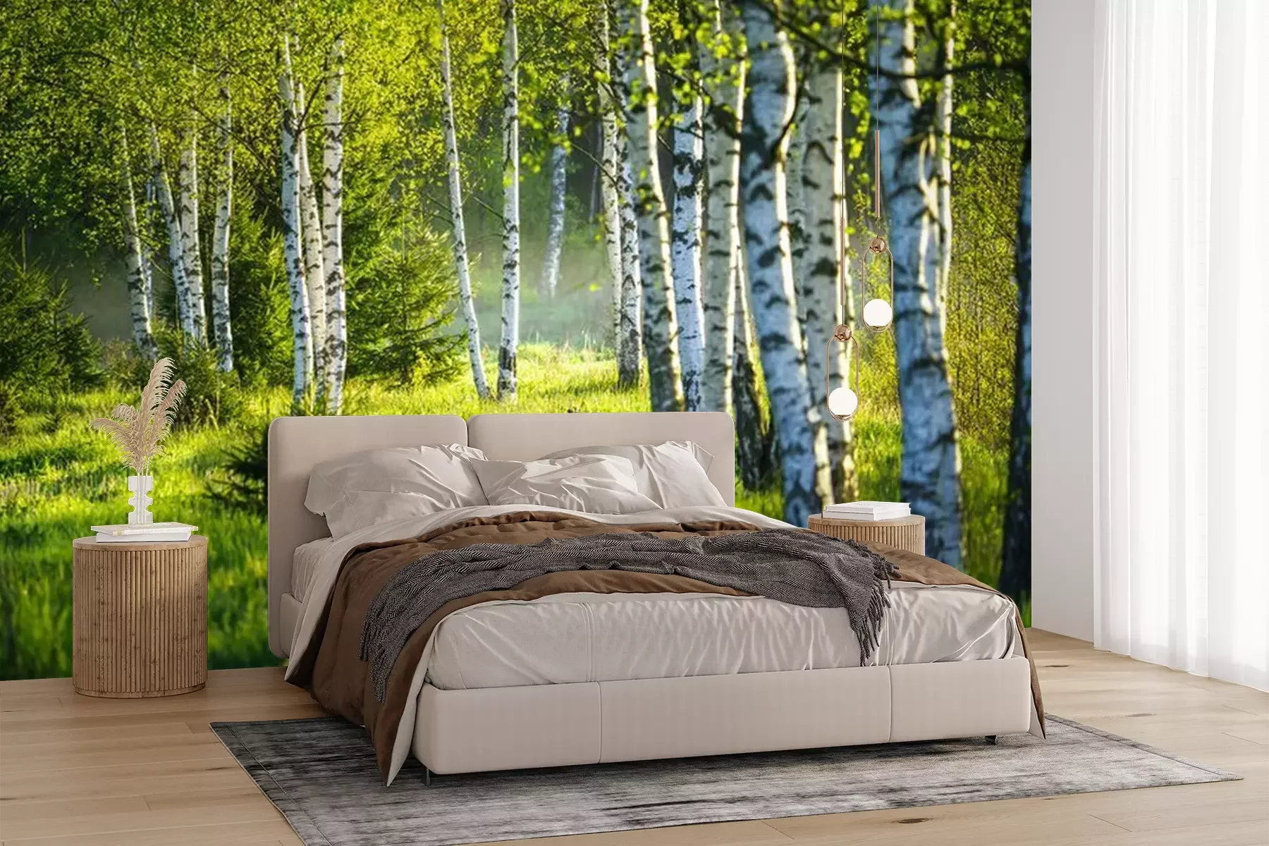 Lente in het berkenbosBij het inrichten van een interieur kiest men vaak voor rustgevende decoraties geïnspireerd op de natuur. Een perfect voorbeeld daarvan is ons fotobehang. Berken die baden in de zon zorgen ervoor dat het in de kamer het hele jaar door lente is. Vrolijke kleuren helpen je te ontspannen na een lange dag en tot rust te komen in een omgeving vol groen, dat de boventoon voert op het voorgestelde fotobehang. Berkenbos aan de muur brengt de natuur dichterbij, zelfs als je in het stadscentrum woont. Zo wordt elke ruimte gezelliger – en dat is nog niet alles wat dit fotobehang te bieden heeft. Berken die dieper het bos in leiden, creëren een ruimtelijk effect, waardoor ons ontwerp ook een uitstekende manier is om een kleine ruimte optisch te vergroten. Het past perfect in een minimalistische slaapkamer in lichte kleuren. Het vormt een harmonieus geheel met meubels van natuurlijk hout en witte textielsoorten zoals linnen gordijnen, een effen sprei en eenvoudige kussens. Ook de inrichting van de woonkamer krijgt meer karakter en uitstraling dankzij dit fotobehang. Bos in de zon zal een ruime eetkamer, een modern kantoor of een kleine woonkamer oplichten. Het voorgestelde ontwerp is bovendien een uitstekende keuze voor commerciële ruimtes. Witte berken zorgen voor een frisse touch in sportruimtes, restaurants of cafés. Waar je het ook wilt gebruiken, je zult geen problemen hebben met de montage van ons fotobehang. Berkenbos zal altijd prachtig tot zijn recht komen op de gekozen wand, want bij het aanbrengen ontstaan er geen lelijke luchtbellen. Dankzij de hoge bestendigheid tegen verkleuring zul je na verloop van tijd geen kleurverlies opmerken en kun je langdurig genieten van de levendige kleuren van ons fotobehang. Berken tegen de achtergrond van een groen bos brengen niet alleen een aangename, natuurlijke sfeer in de ruimte, maar behouden ook langdurig hun esthetische uitstraling – ons product is krasbestendig en eenvoudig schoon te maken, wat het tot een perfecte keuze maakt voor drukbezochte ruimtes.