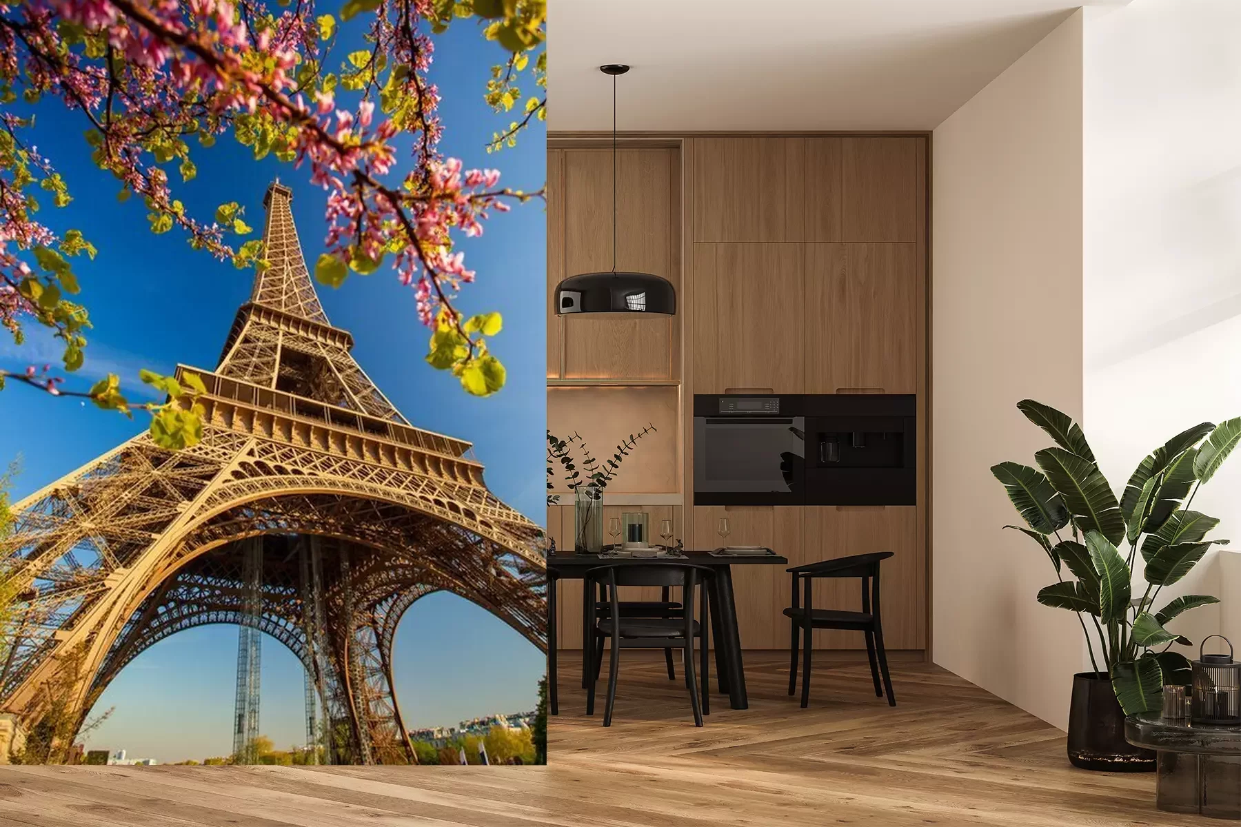 Het materiaal Premium is een glad vinyl op vlies, dat bestand is tegen uitrekken en vervorming. Het is dampdoorlatend – de muren kunnen vrij ademen – waardoor het geschikt is voor gebruik in de keuken en badkamer. Bij vervuiling kan het materiaal worden afgenomen met een vochtige doek. De maximale breedte van één baan bedraagt 95 of 105 cm, afhankelijk van de beschikbaarheid. Montage vindt plaats met de rand-aan-rand methode, wat een esthetisch resultaat zonder zichtbare naden oplevert. Omdat de lijm rechtstreeks op de muur wordt aangebracht, verloopt de installatie van het fotobehang snel en eenvoudig.