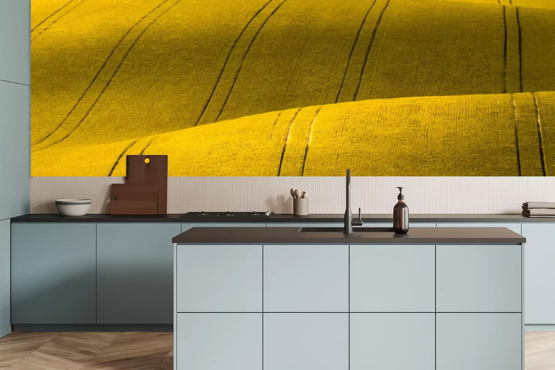 Het materiaal Premium is een glad vinyl op vlies, dat bestand is tegen uitrekken en vervorming. Het is dampdoorlatend – de muren kunnen vrij ademen – waardoor het geschikt is voor gebruik in de keuken en badkamer. Bij vervuiling kan het materiaal worden afgenomen met een vochtige doek. De maximale breedte van één baan bedraagt 95 of 105 cm, afhankelijk van de beschikbaarheid. Montage vindt plaats met de rand-aan-rand methode, wat een esthetisch resultaat zonder zichtbare naden oplevert. Omdat de lijm rechtstreeks op de muur wordt aangebracht, verloopt de installatie van het fotobehang snel en eenvoudig.