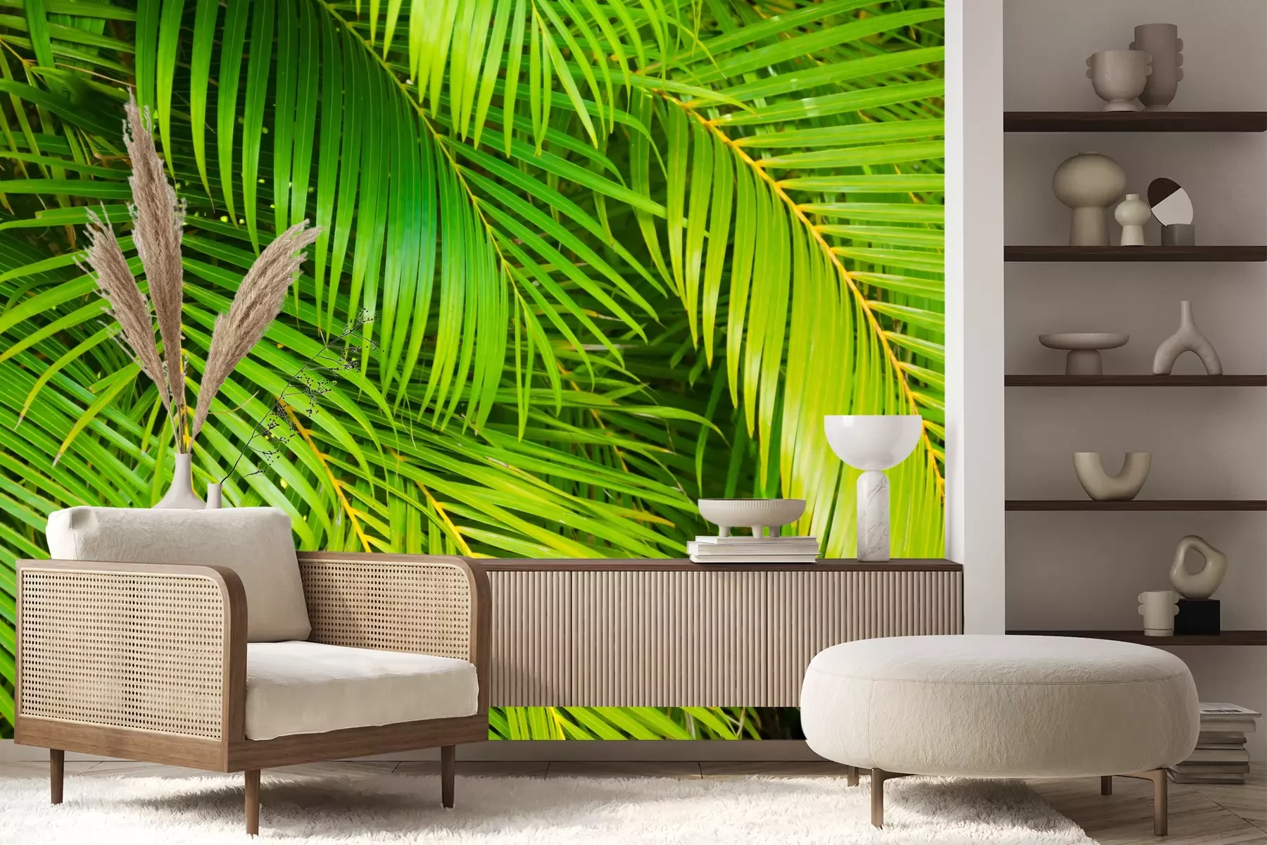 Het materiaal Premium+ is een gestructureerd vinyl op vlies met een gewicht van 255 g/m², dat kleine oneffenheden in de muur effectief camoufleert. De subtiele structuur van fijn zand geeft het oppervlak een exclusieve uitstraling, terwijl de halfmatte afwerking de diepte van de kleuren benadrukt. Het materiaal is dampdoorlatend, waardoor het ook in de keuken en badkamer kan worden gebruikt. De maximale breedte van één baan bedraagt 100 cm – bij grotere afmetingen wordt het fotobehang in meerdere gelijke banen verdeeld. De lijm wordt direct op de muur aangebracht en het behang wordt rand-aan-rand geplakt, wat zorgt voor een esthetisch resultaat zonder zichtbare naden. Het oppervlak kan gemakkelijk worden schoongemaakt door het voorzichtig af te nemen met een vochtige doek.