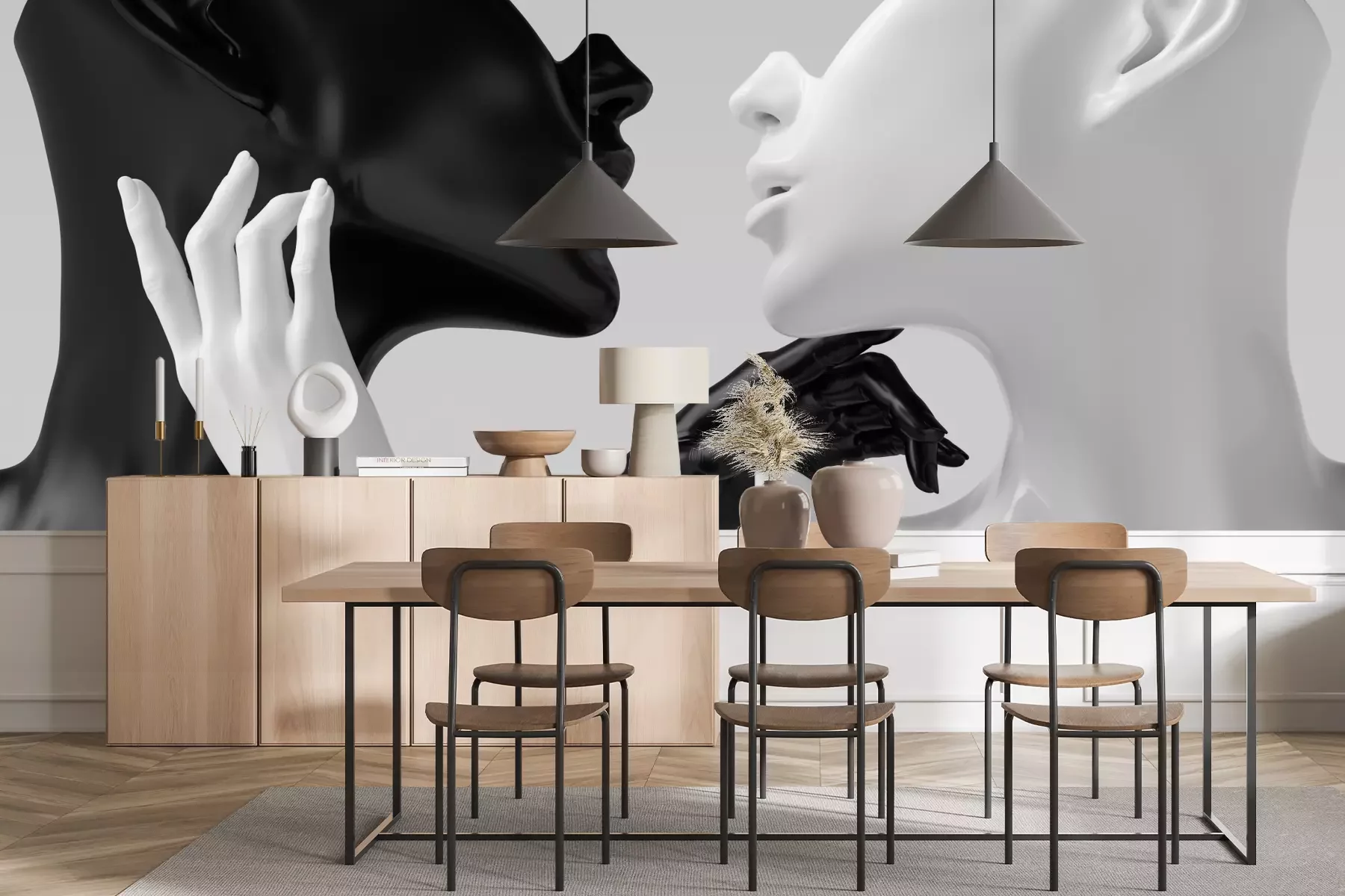 Het materiaal Premium+ is een gestructureerd vinyl op vlies met een gewicht van 255 g/m², dat kleine oneffenheden in de muur effectief camoufleert. De subtiele structuur van fijn zand geeft het oppervlak een exclusieve uitstraling, terwijl de halfmatte afwerking de diepte van de kleuren benadrukt. Het materiaal is dampdoorlatend, waardoor het ook in de keuken en badkamer kan worden gebruikt. De maximale breedte van één baan bedraagt 100 cm – bij grotere afmetingen wordt het fotobehang in meerdere gelijke banen verdeeld. De lijm wordt direct op de muur aangebracht en het behang wordt rand-aan-rand geplakt, wat zorgt voor een esthetisch resultaat zonder zichtbare naden. Het oppervlak kan gemakkelijk worden schoongemaakt door het voorzichtig af te nemen met een vochtige doek.