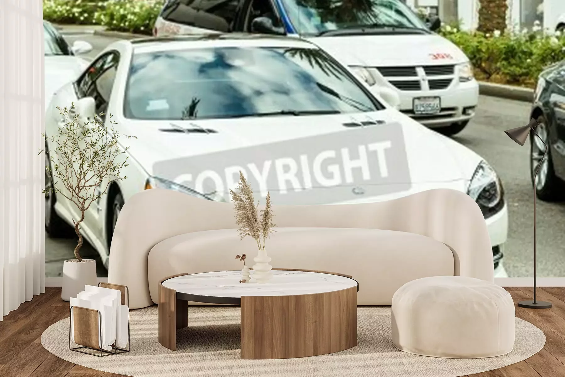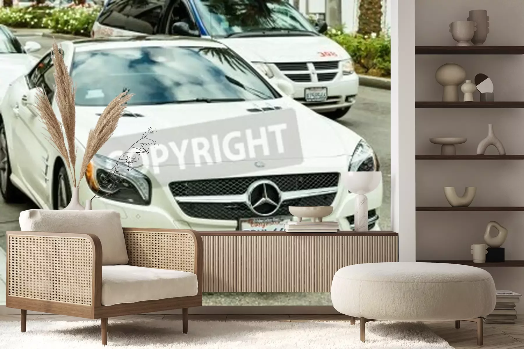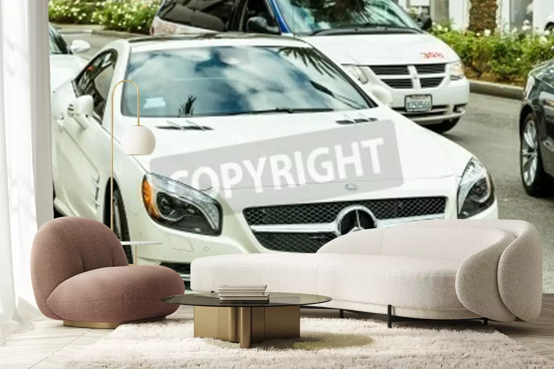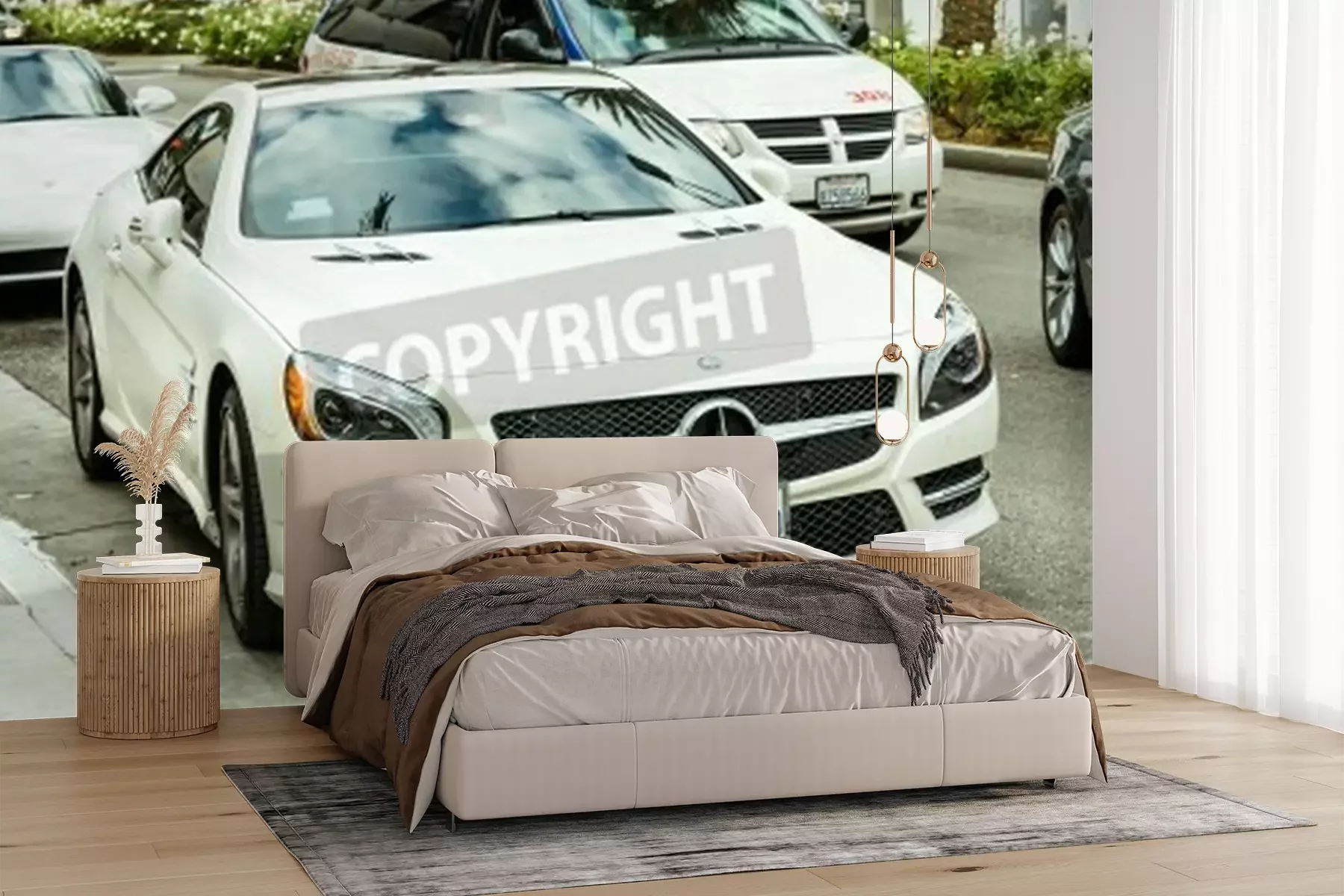 Fotobehang LOS ANGELES - DECEMBER 18, 2013: white Mercedes Benz SL 550 parked on Rodeo Drive. The brand is used automobiles, buses, coaches, and trucks. The headquarters are in Stuttgart, Germany.