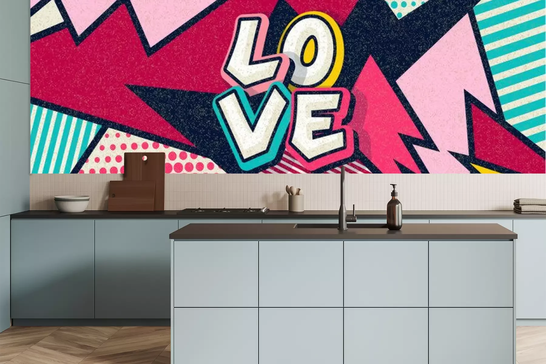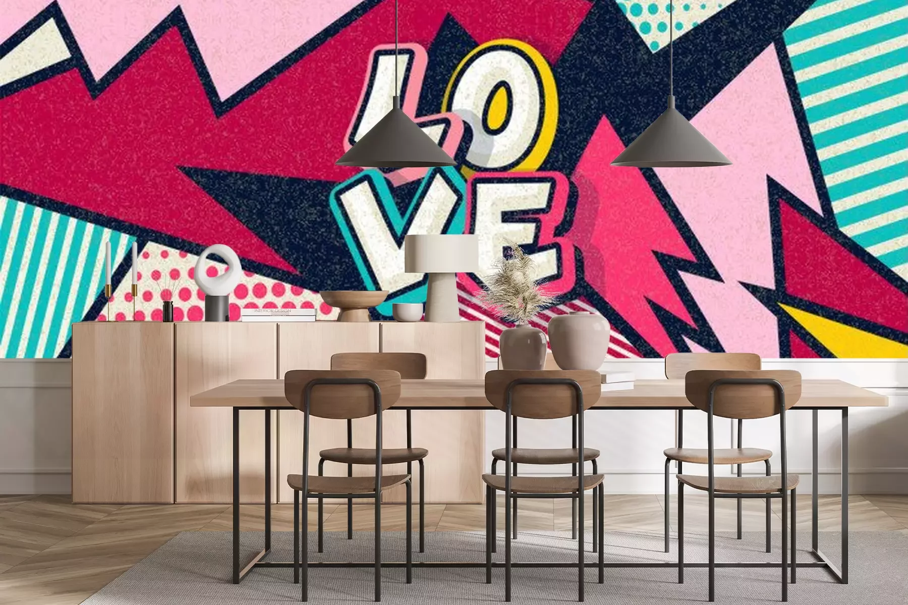 Fotobehang Love! Pop art funny comic word. Fashionable poster and banner. Social Media Connecting Blog Communication Content. Trendy and fashion color retro vintage illustration background. Vector easy editable