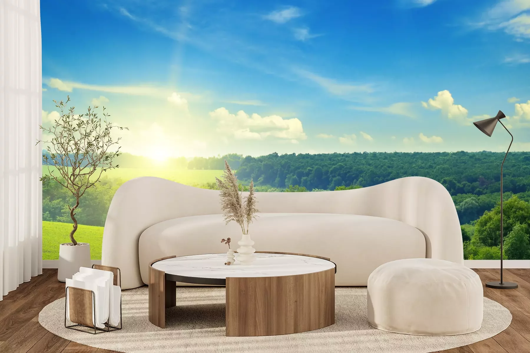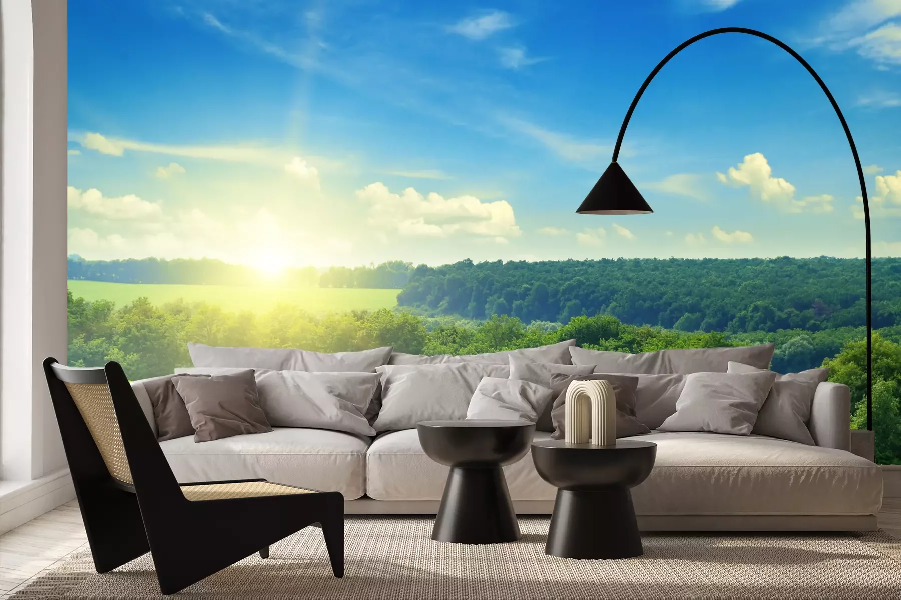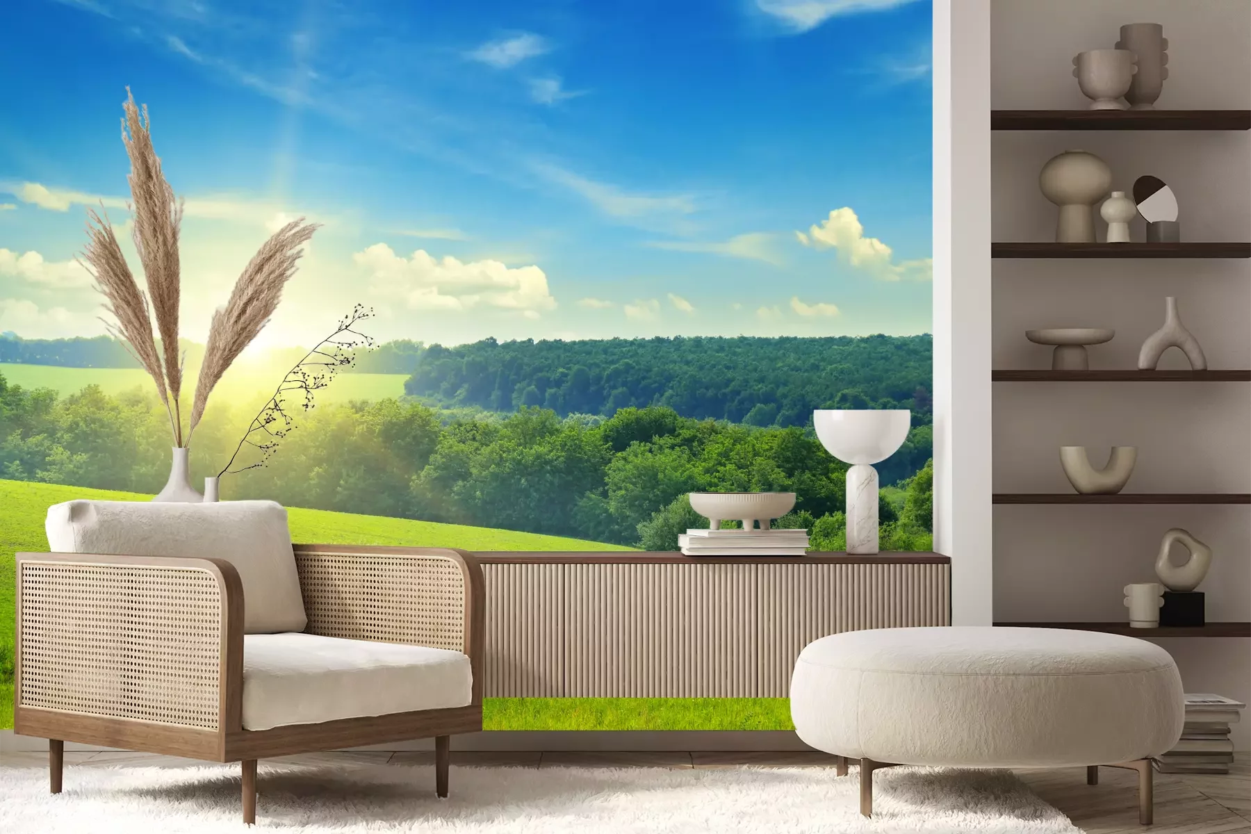 Het materiaal Premium+ is een gestructureerd vinyl op vlies met een gewicht van 255 g/m², dat kleine oneffenheden in de muur effectief camoufleert. De subtiele structuur van fijn zand geeft het oppervlak een exclusieve uitstraling, terwijl de halfmatte afwerking de diepte van de kleuren benadrukt. Het materiaal is dampdoorlatend, waardoor het ook in de keuken en badkamer kan worden gebruikt. De maximale breedte van één baan bedraagt 100 cm – bij grotere afmetingen wordt het fotobehang in meerdere gelijke banen verdeeld. De lijm wordt direct op de muur aangebracht en het behang wordt rand-aan-rand geplakt, wat zorgt voor een esthetisch resultaat zonder zichtbare naden. Het oppervlak kan gemakkelijk worden schoongemaakt door het voorzichtig af te nemen met een vochtige doek.
