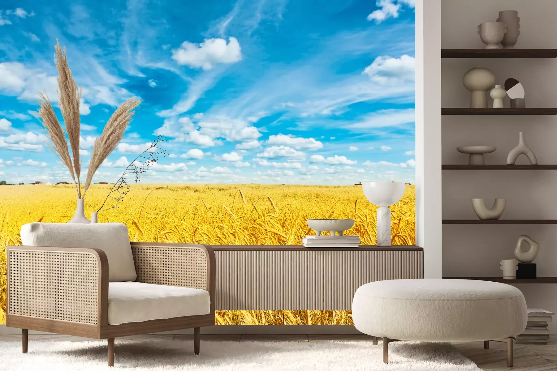 Het materiaal Premium+ is een gestructureerd vinyl op vlies met een gewicht van 255 g/m², dat kleine oneffenheden in de muur effectief camoufleert. De subtiele structuur van fijn zand geeft het oppervlak een exclusieve uitstraling, terwijl de halfmatte afwerking de diepte van de kleuren benadrukt. Het materiaal is dampdoorlatend, waardoor het ook in de keuken en badkamer kan worden gebruikt. De maximale breedte van één baan bedraagt 100 cm – bij grotere afmetingen wordt het fotobehang in meerdere gelijke banen verdeeld. De lijm wordt direct op de muur aangebracht en het behang wordt rand-aan-rand geplakt, wat zorgt voor een esthetisch resultaat zonder zichtbare naden. Het oppervlak kan gemakkelijk worden schoongemaakt door het voorzichtig af te nemen met een vochtige doek.