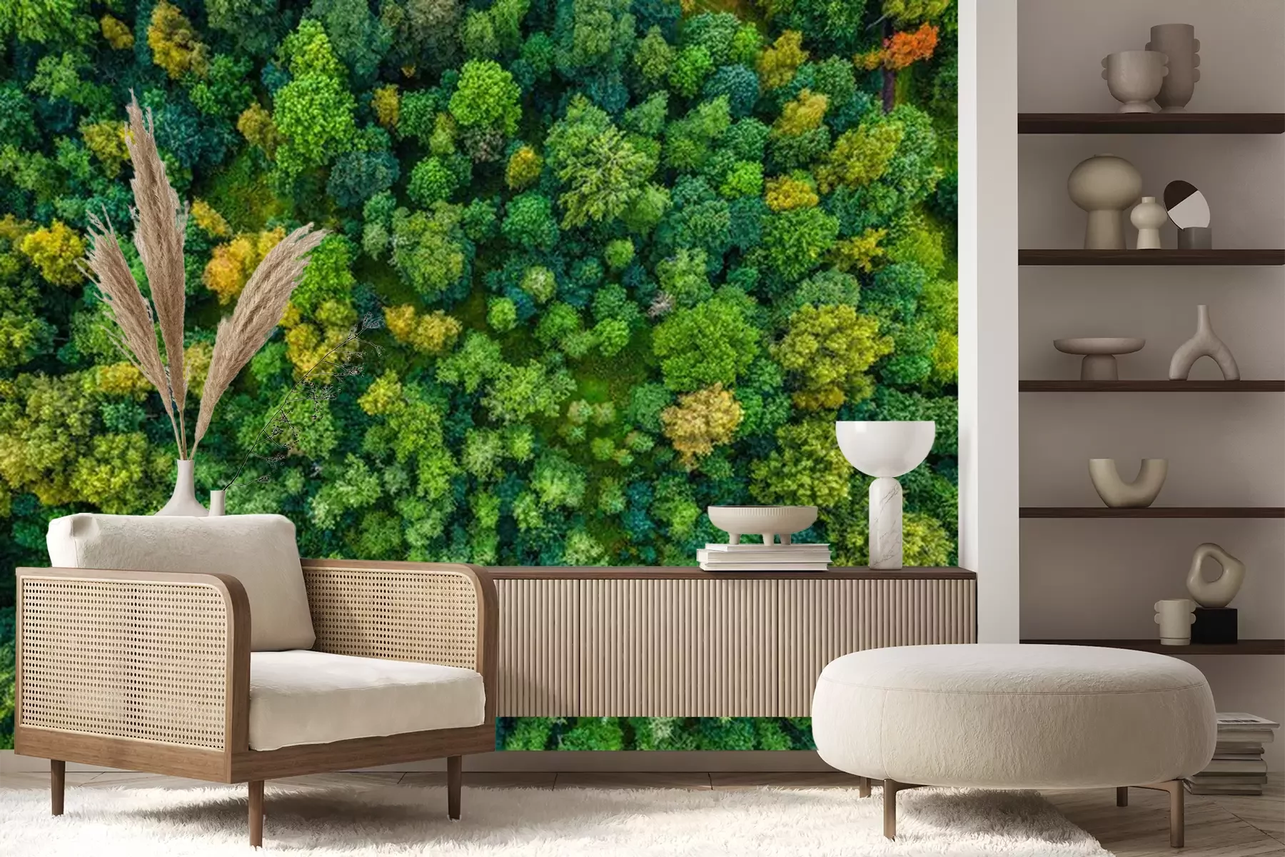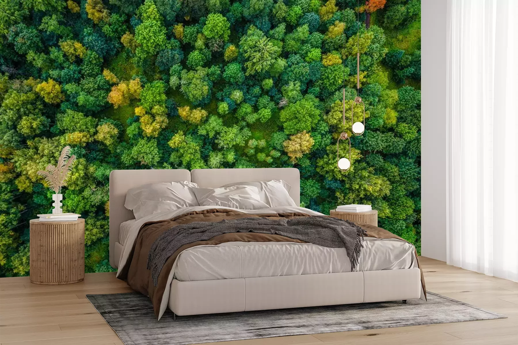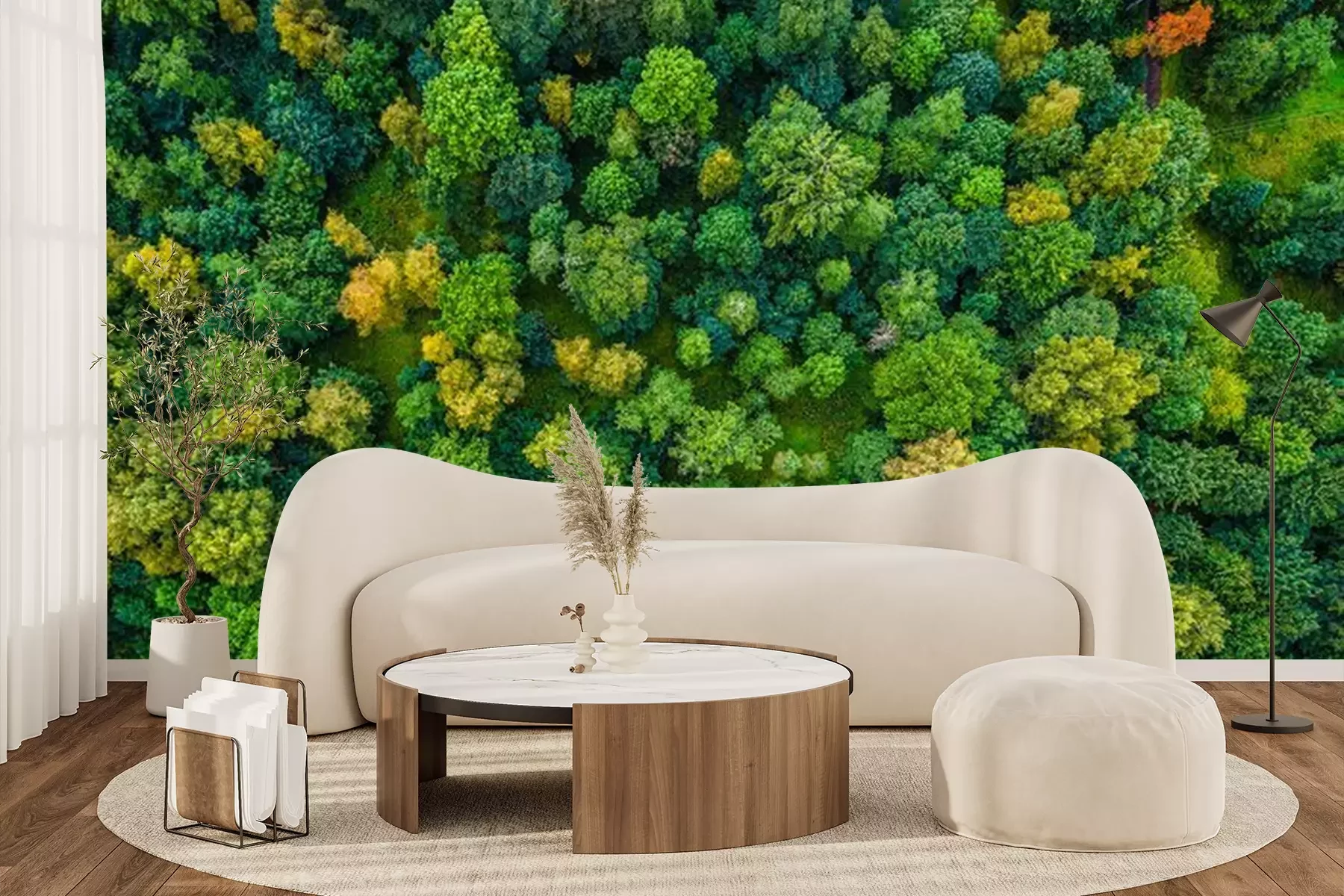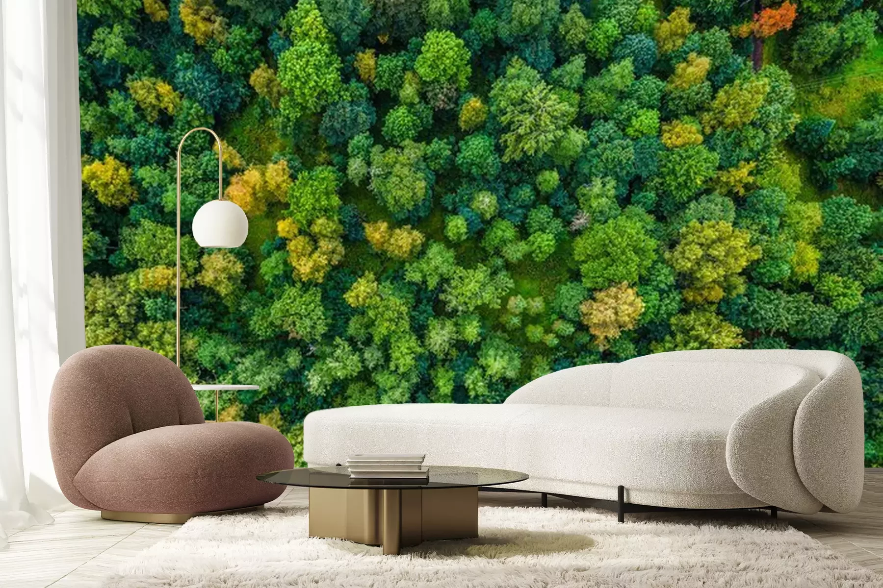 Fotobehang Luchtfoto van herfst bomen. Kleurrijke bomen van bovenaf.