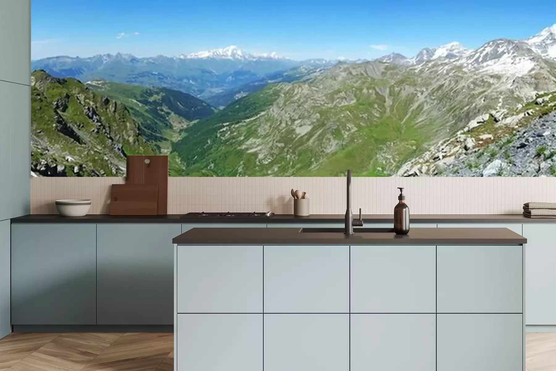 Het materiaal Premium is een glad vinyl op vlies, dat bestand is tegen uitrekken en vervorming. Het is dampdoorlatend – de muren kunnen vrij ademen – waardoor het geschikt is voor gebruik in de keuken en badkamer. Bij vervuiling kan het materiaal worden afgenomen met een vochtige doek. De maximale breedte van één baan bedraagt 95 of 105 cm, afhankelijk van de beschikbaarheid. Montage vindt plaats met de rand-aan-rand methode, wat een esthetisch resultaat zonder zichtbare naden oplevert. Omdat de lijm rechtstreeks op de muur wordt aangebracht, verloopt de installatie van het fotobehang snel en eenvoudig.