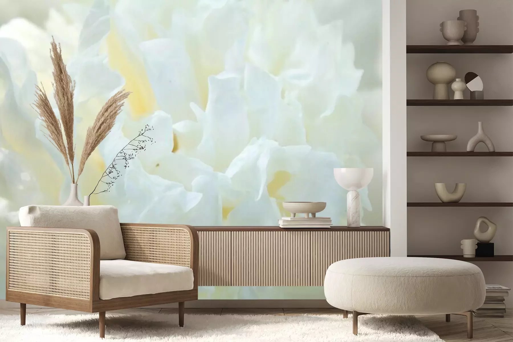 Het materiaal Premium+ is een gestructureerd vinyl op vlies met een gewicht van 255 g/m², dat kleine oneffenheden in de muur effectief camoufleert. De subtiele structuur van fijn zand geeft het oppervlak een exclusieve uitstraling, terwijl de halfmatte afwerking de diepte van de kleuren benadrukt. Het materiaal is dampdoorlatend, waardoor het ook in de keuken en badkamer kan worden gebruikt. De maximale breedte van één baan bedraagt 100 cm – bij grotere afmetingen wordt het fotobehang in meerdere gelijke banen verdeeld. De lijm wordt direct op de muur aangebracht en het behang wordt rand-aan-rand geplakt, wat zorgt voor een esthetisch resultaat zonder zichtbare naden. Het oppervlak kan gemakkelijk worden schoongemaakt door het voorzichtig af te nemen met een vochtige doek.