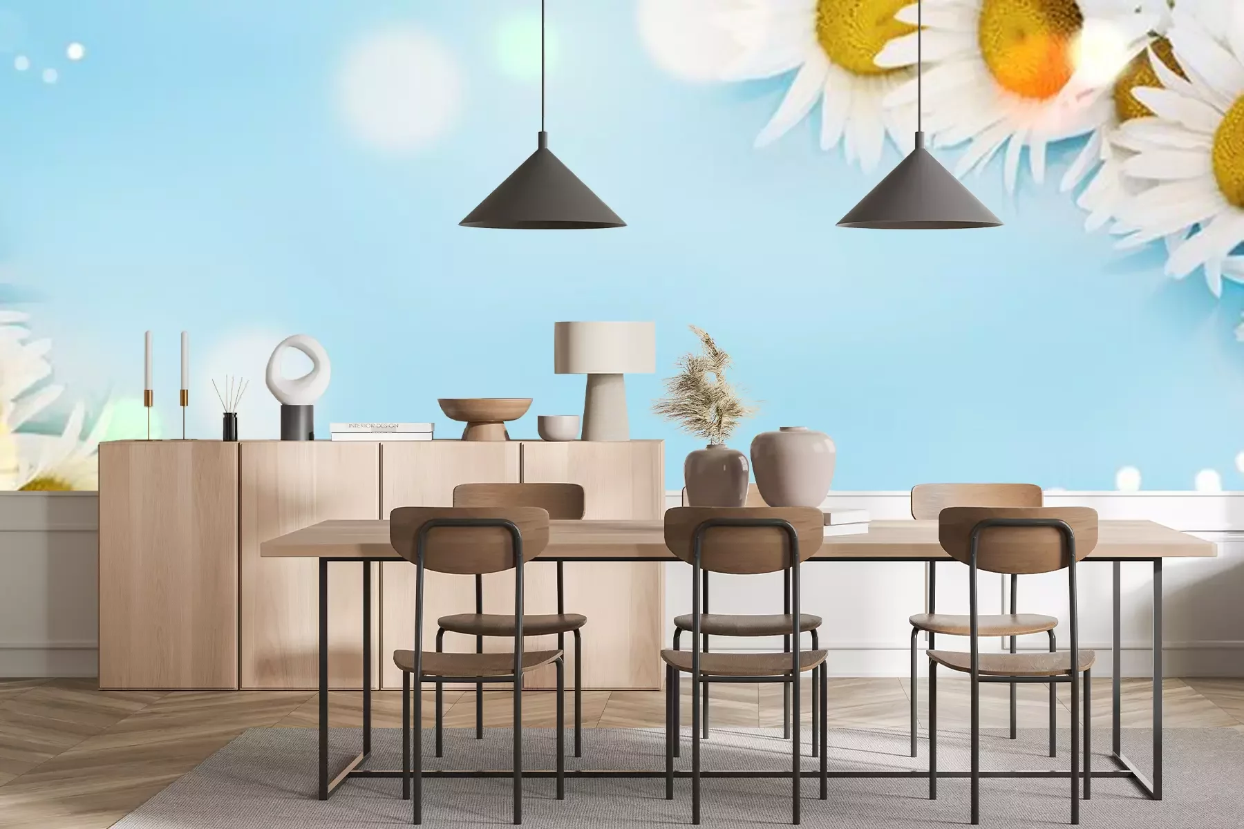 Fotobehang Madeliefjes op een blauwe achtergrond