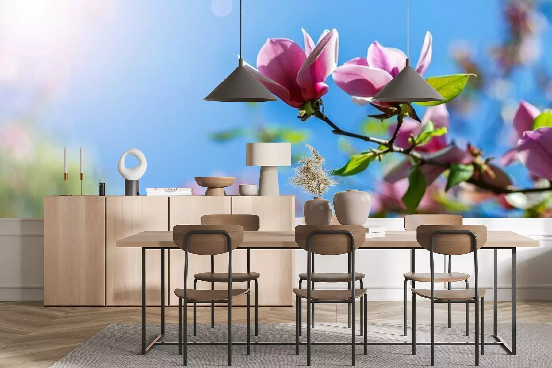 Het materiaal Premium+ is een gestructureerd vinyl op vlies met een gewicht van 255 g/m², dat kleine oneffenheden in de muur effectief camoufleert. De subtiele structuur van fijn zand geeft het oppervlak een exclusieve uitstraling, terwijl de halfmatte afwerking de diepte van de kleuren benadrukt. Het materiaal is dampdoorlatend, waardoor het ook in de keuken en badkamer kan worden gebruikt. De maximale breedte van één baan bedraagt 100 cm – bij grotere afmetingen wordt het fotobehang in meerdere gelijke banen verdeeld. De lijm wordt direct op de muur aangebracht en het behang wordt rand-aan-rand geplakt, wat zorgt voor een esthetisch resultaat zonder zichtbare naden. Het oppervlak kan gemakkelijk worden schoongemaakt door het voorzichtig af te nemen met een vochtige doek.